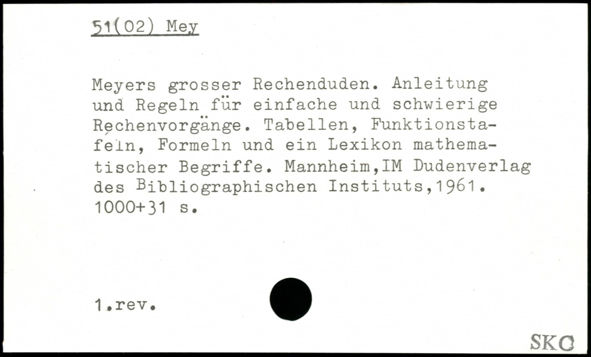 Meyers grosser Rechenduden. Anleitung und Regeln für einfache und schwierige Rechenvorgänge. Tabellen, Funktionsta-feln, Formeln und ein Lexikon mathematischer Begriffe. Mannheim,IM Dudenverlag des Bibliographischen Instituts,1961.