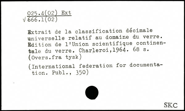 Extrait de la classification décimale universelle relatif au domaine du verre. Edition de l'Union scientifique continentale du verre. Charleroi,19^4.