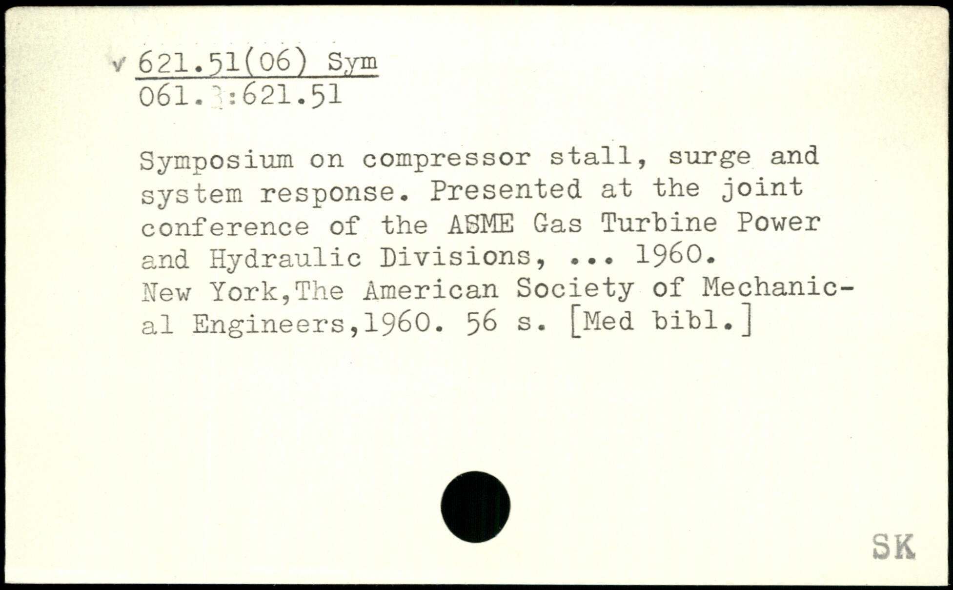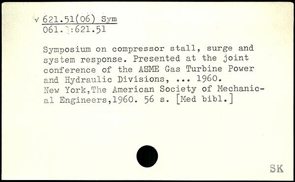 Symposium on compressor stall, surge and system response. Presented at the joint conference of the ASME Gas Turbine Power and Hydraulic Divisions, ... 1960. New York,The American Society of Mechanical Engineers,1960.