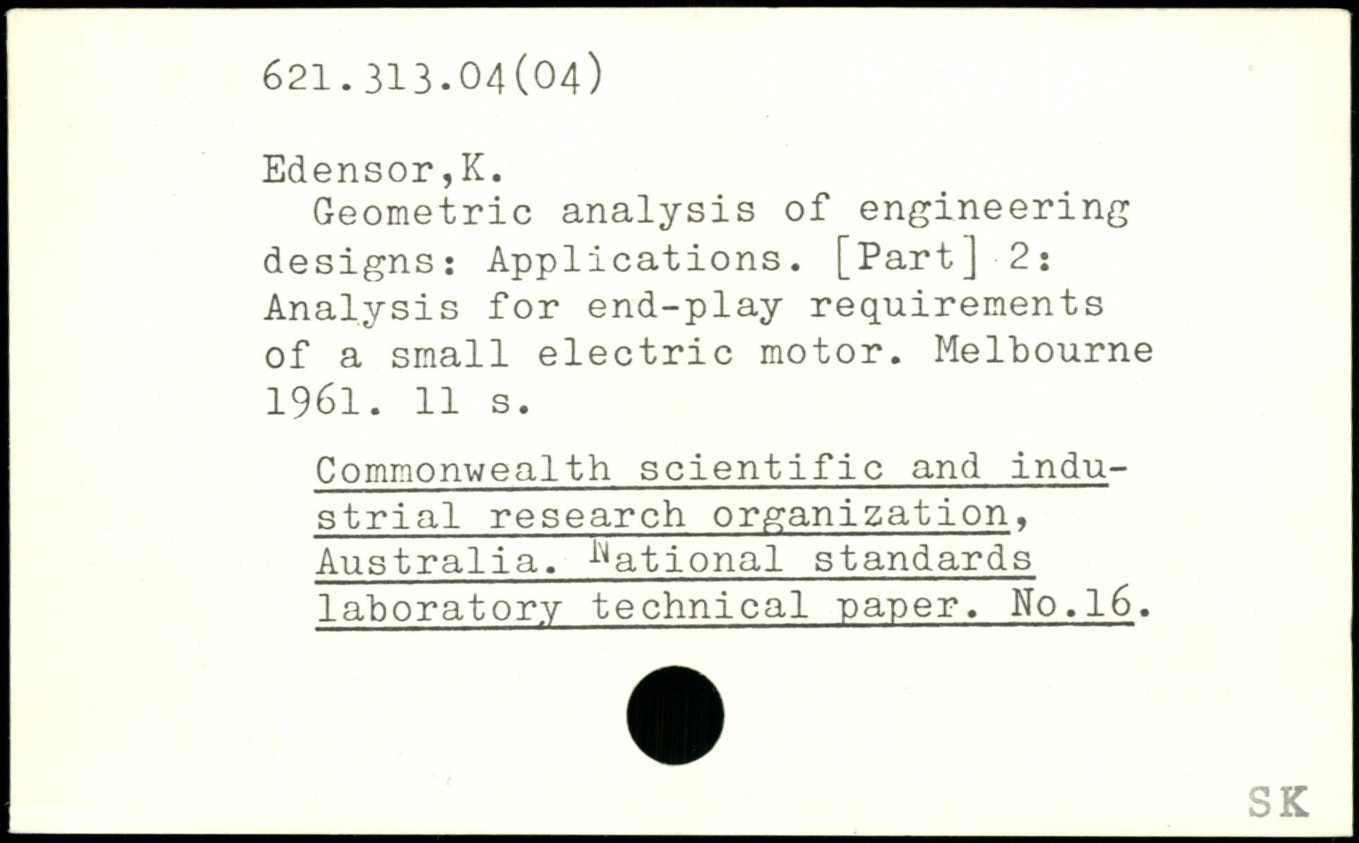 Geometric analysis of engineering designs: Applications. [Part] 2: Analysis for end-play requirements of a small electric motor. Melbourne 1961.