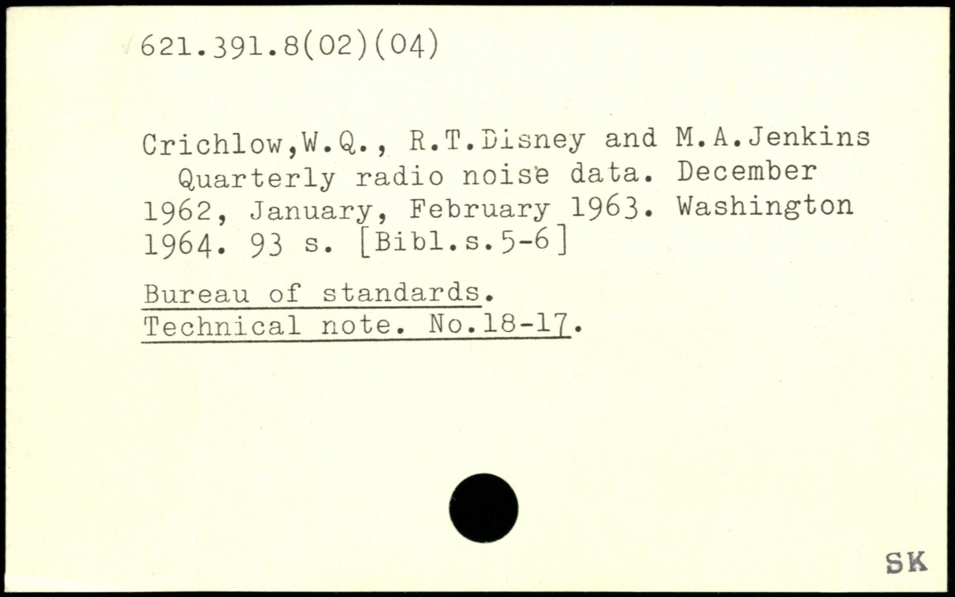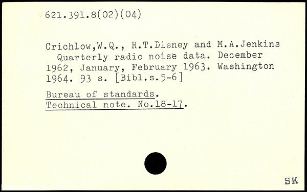 Crichlow,W.Q. , R.T. Disney and M. A. Jenkins Quarterly radio noise data. December 1962, January, February 1963.
