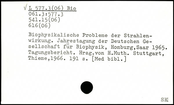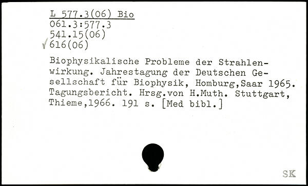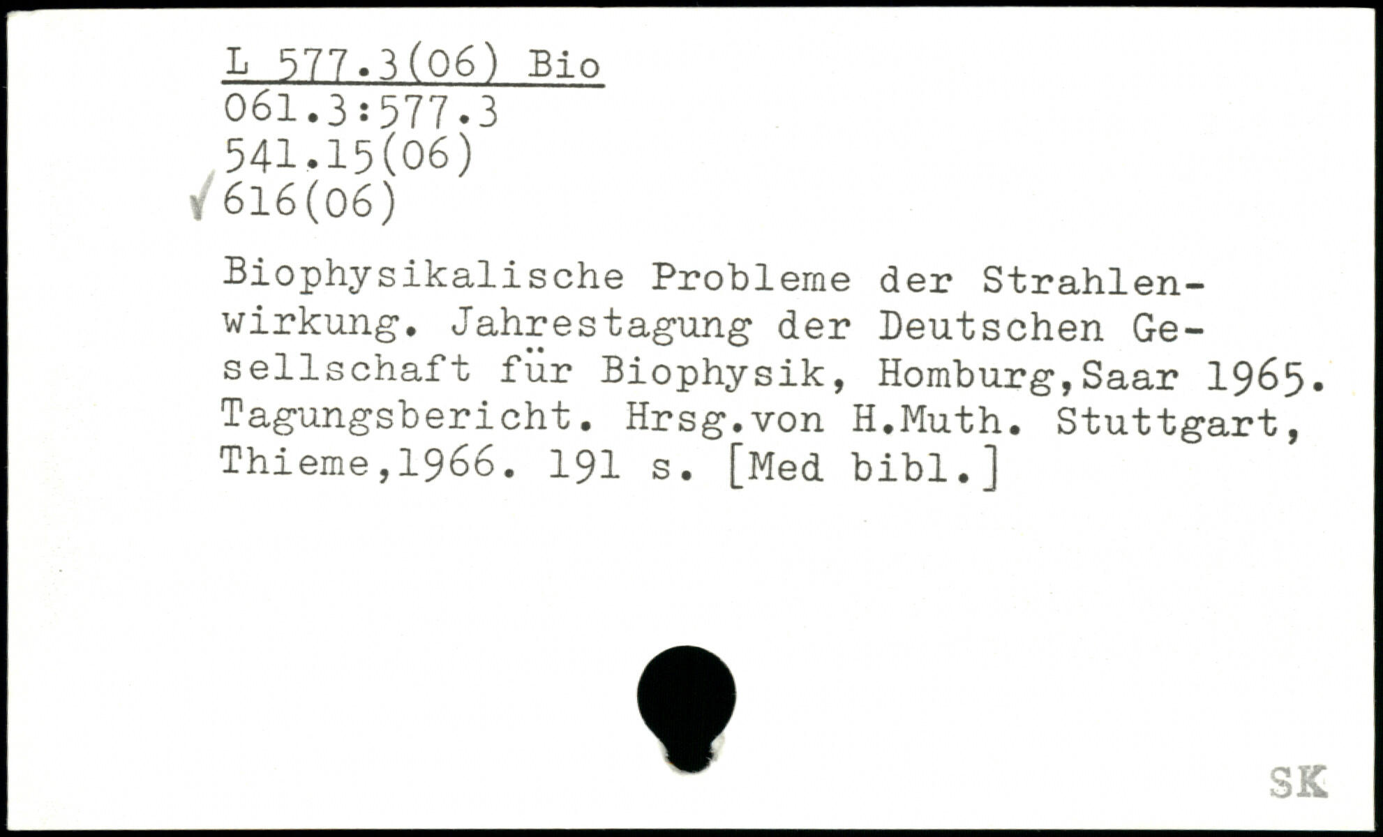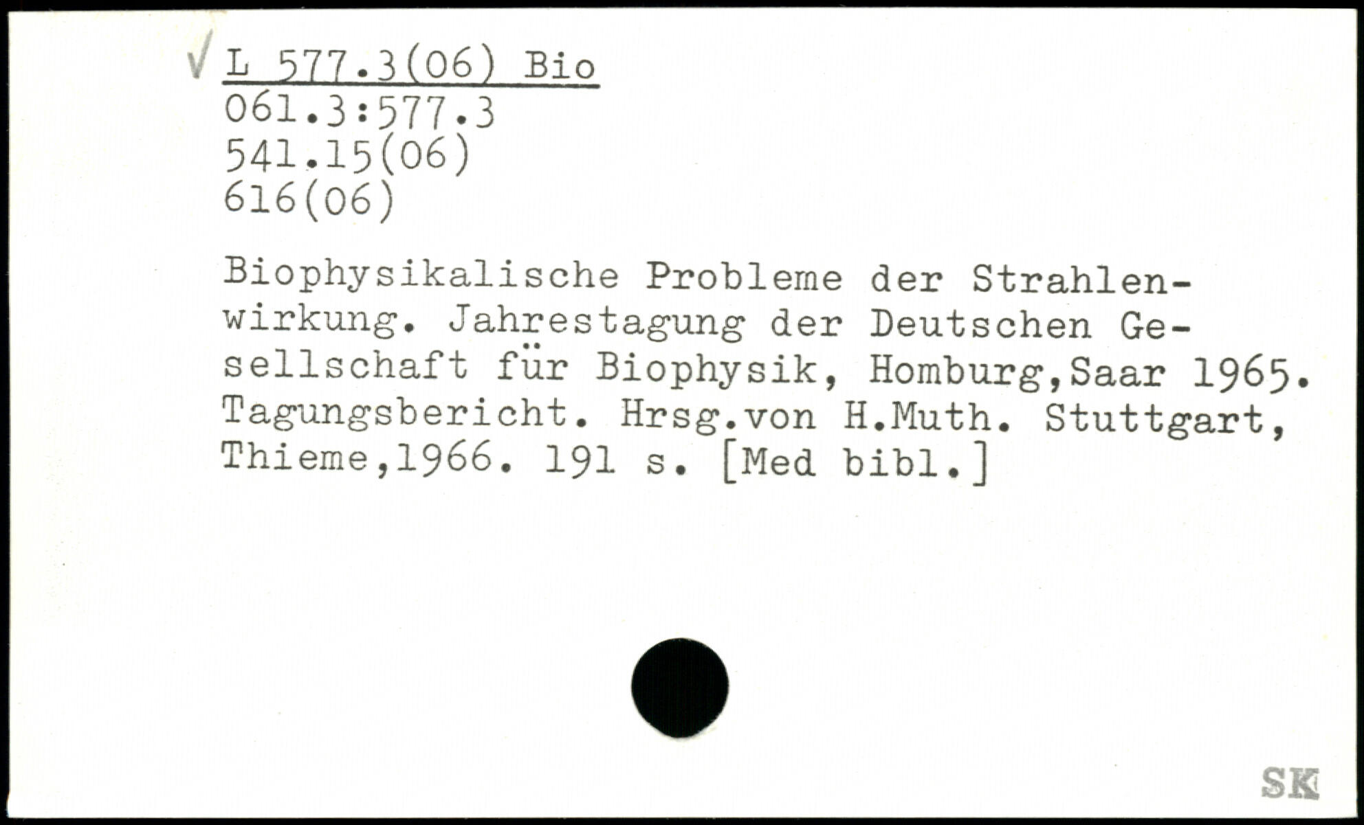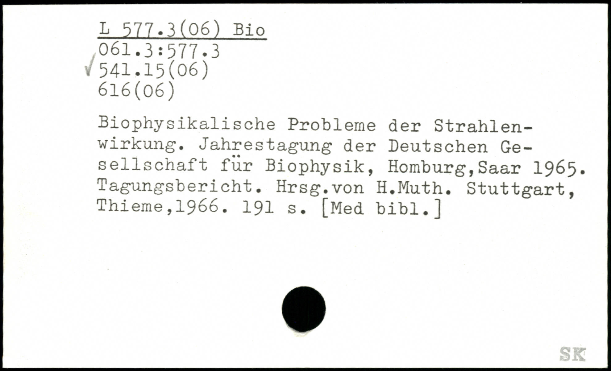 Biophysikalische Probleme der Strahlenwirkung. Jahrestagung der Deutschen Gesellschaft für Biophysik, Homburg,Saar 1965. Tagungsbericht. Hrsg.von H.Muth.