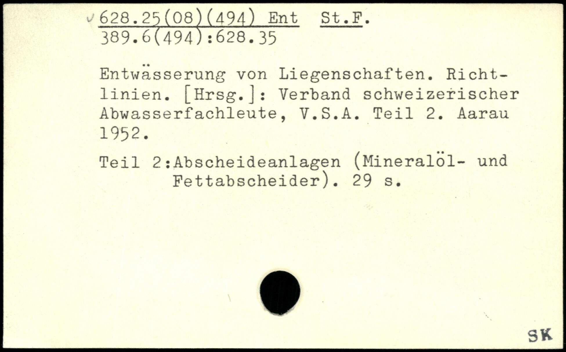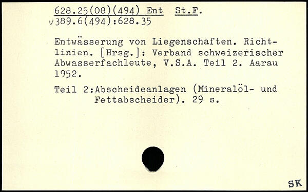 Entwässerung von Liegenschaften. Richtlinien. [Hrsg.J: Verband schweizerischer Abwasserfachleute, V.S.A. Teil 2. Aarau 1952. Teil 2:Abscheideanlagen (Mineralöl- und Fettabscheider).