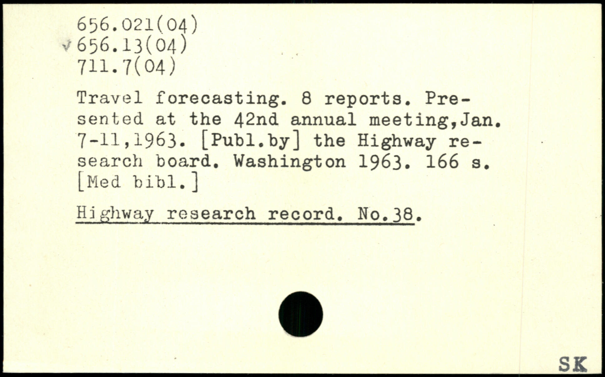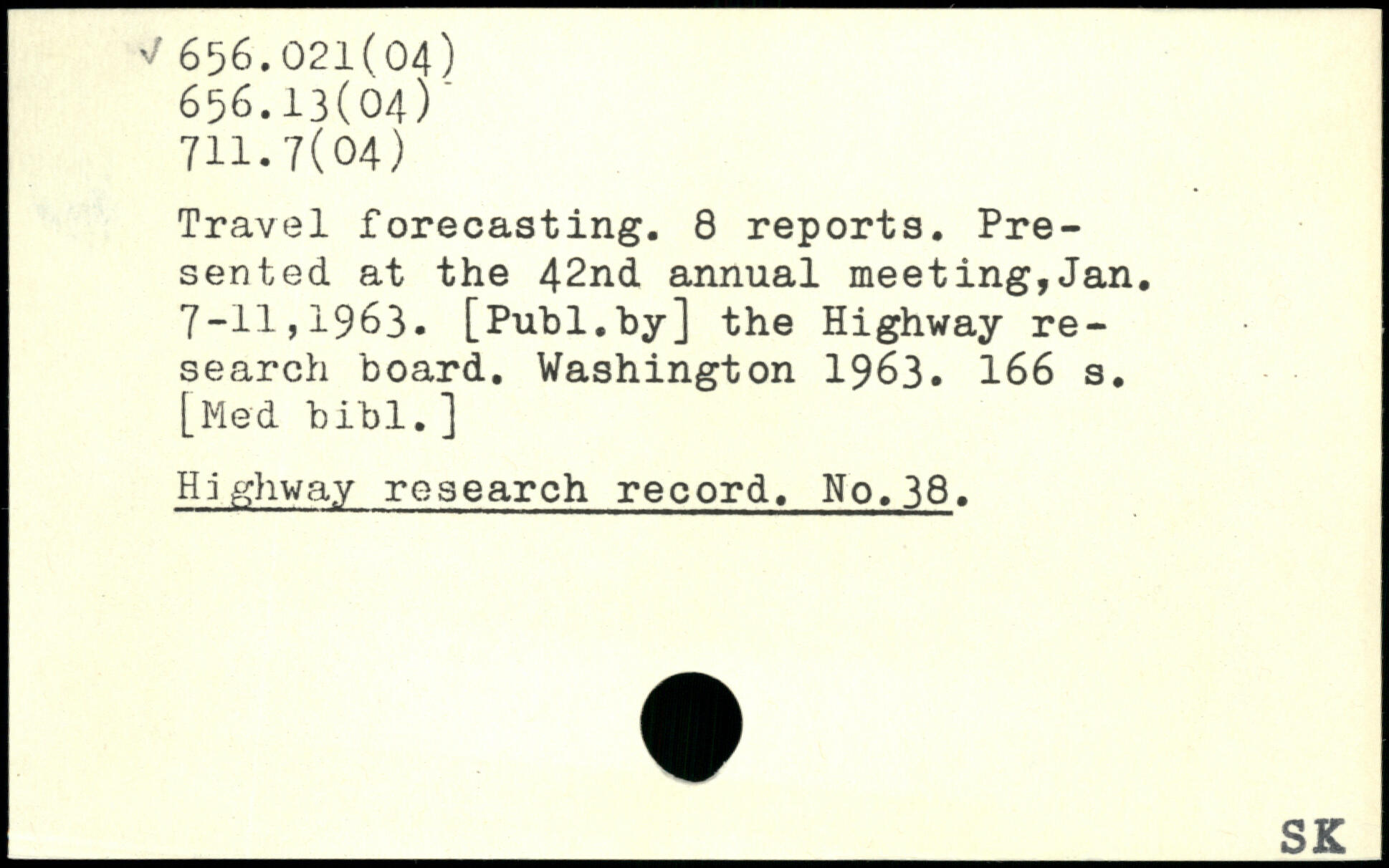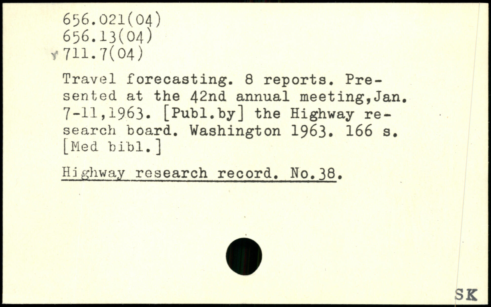 Travel forecasting. 8 reports. Presented at the 42nd annual meeting,Jan. 7-11,1963.
