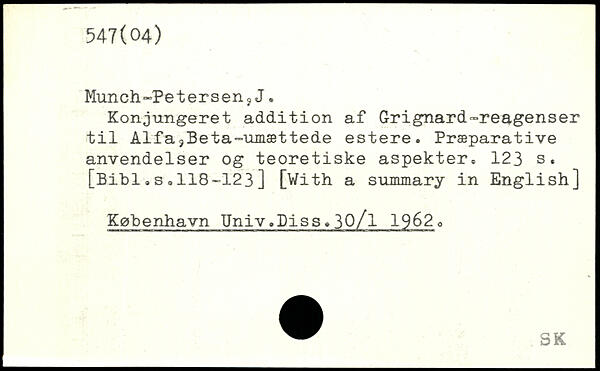 Munch.-Pet er s en ? J, Konjungeret addition af Grignard-reagenser til AlfajBeta-umættede estere. Præparative anvendelser og teoretiske aspekter.
