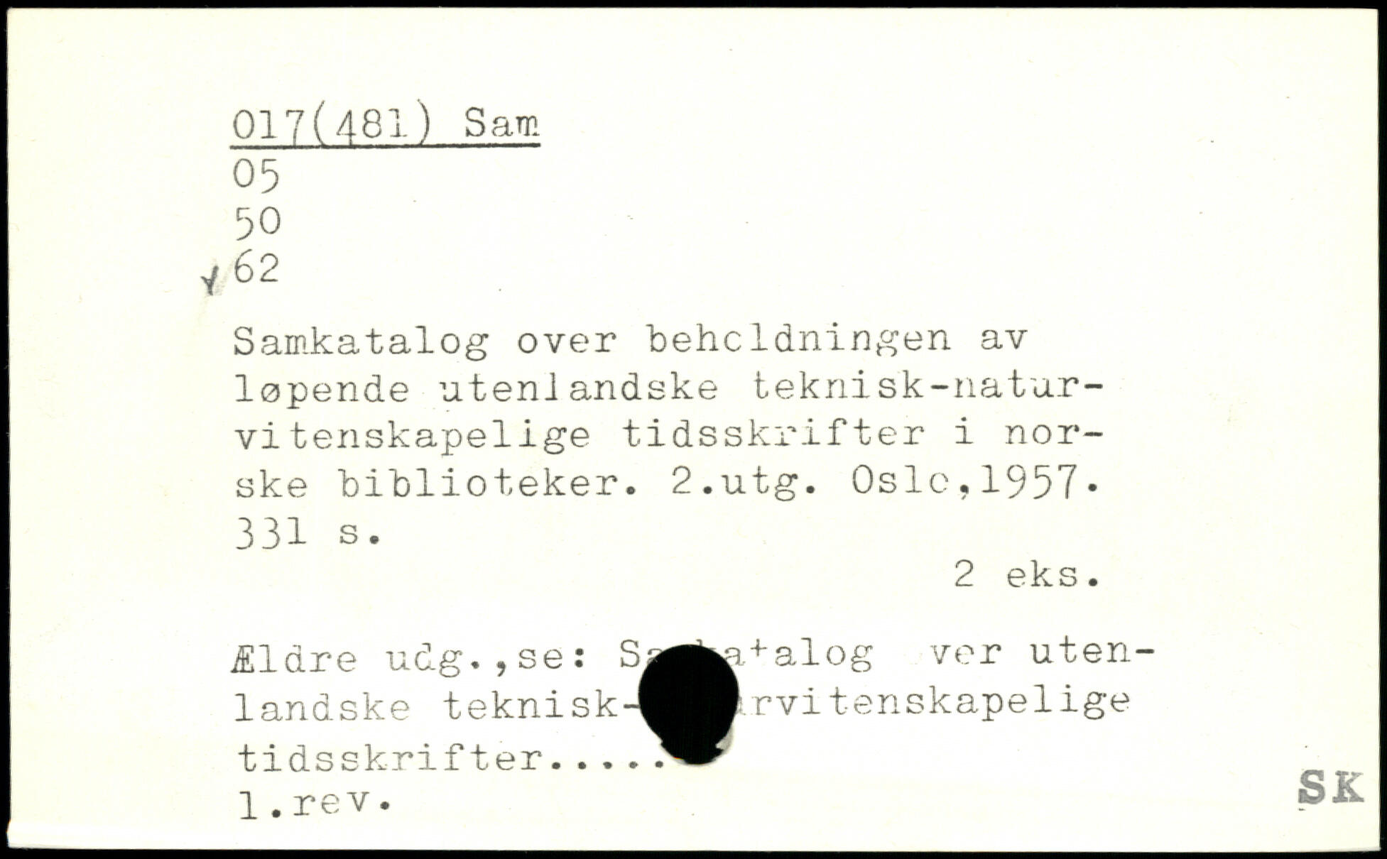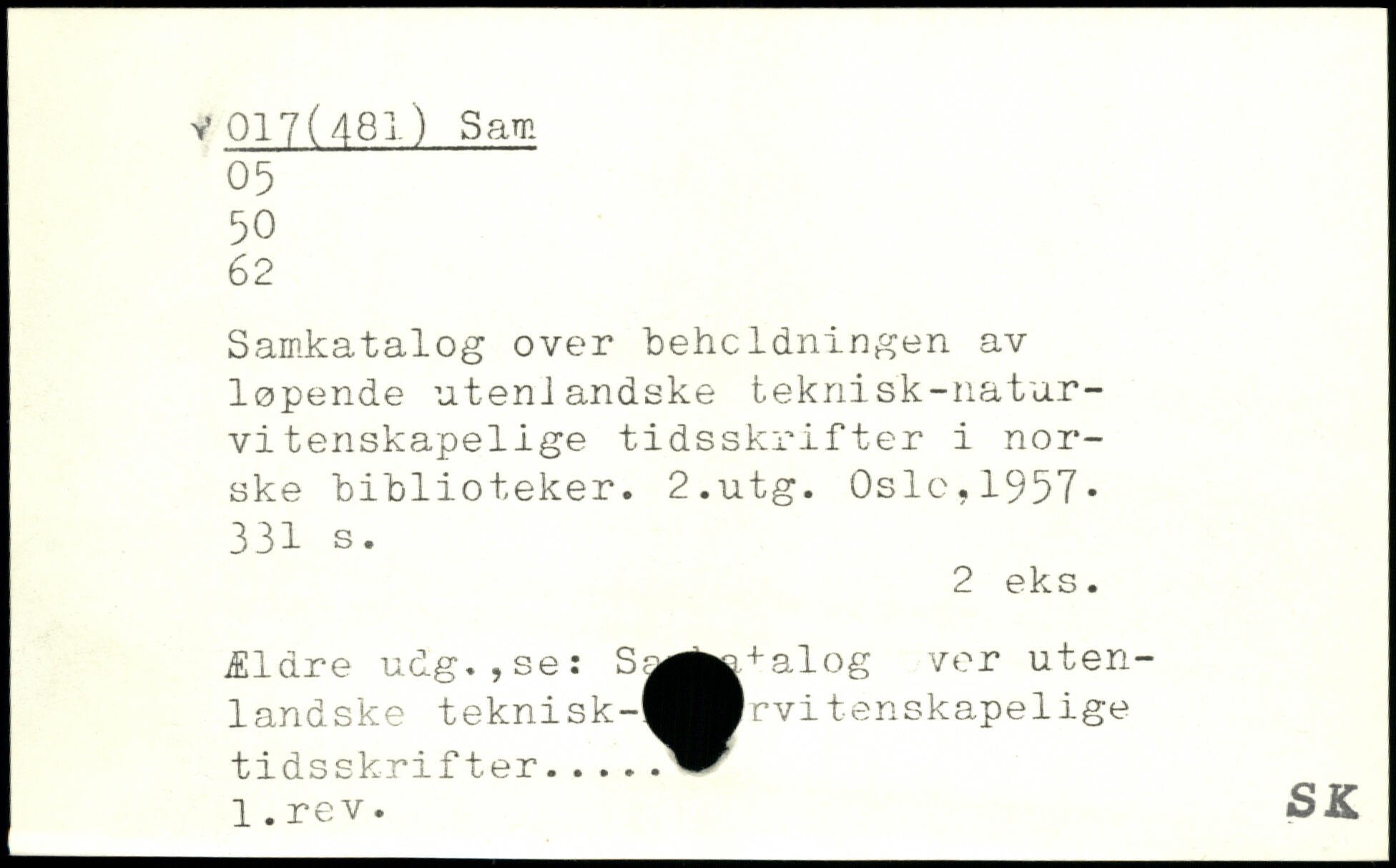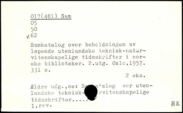 Samkatalog over beholdningen av løpende utenlandske teknisk-natur-vitenskapelige tidsskrifter i norske biblioteker. 2.utg. Oslo,1957.