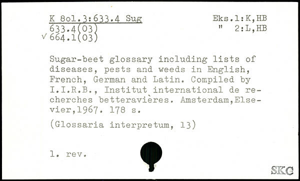 Sugar-beet glossary including lists of diseases, pests and weeds in English, French, German and Latin. Compiled by I.I.R.B., Institut international de recherches betteravières.