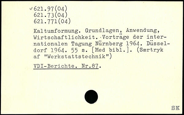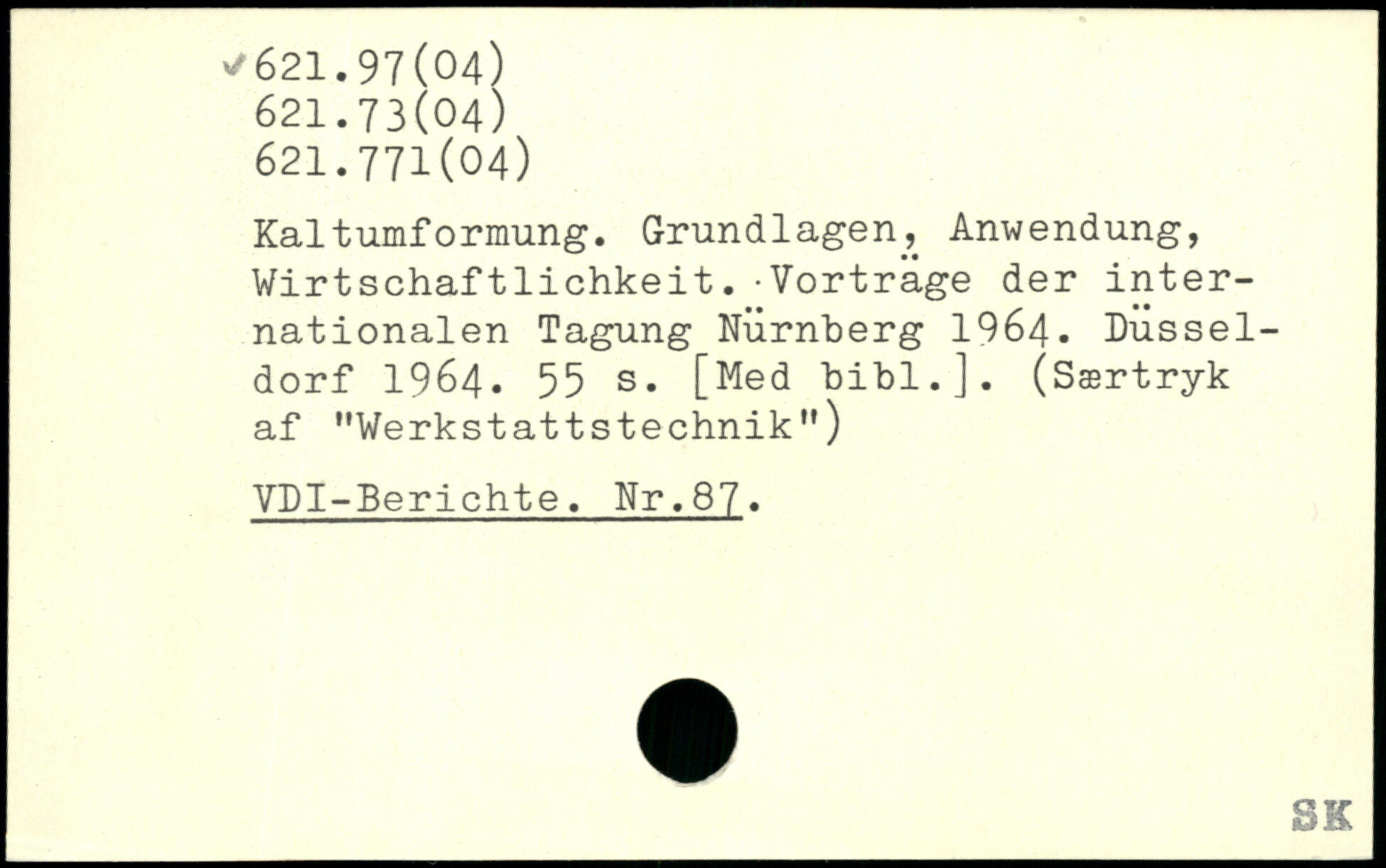 KaltUmformung. Grundlagen, Anwendung, Wirtschaftlichkeit.-Vorträge der internationalen Tagung Nürnberg 1964. Düsseldorf 1964.