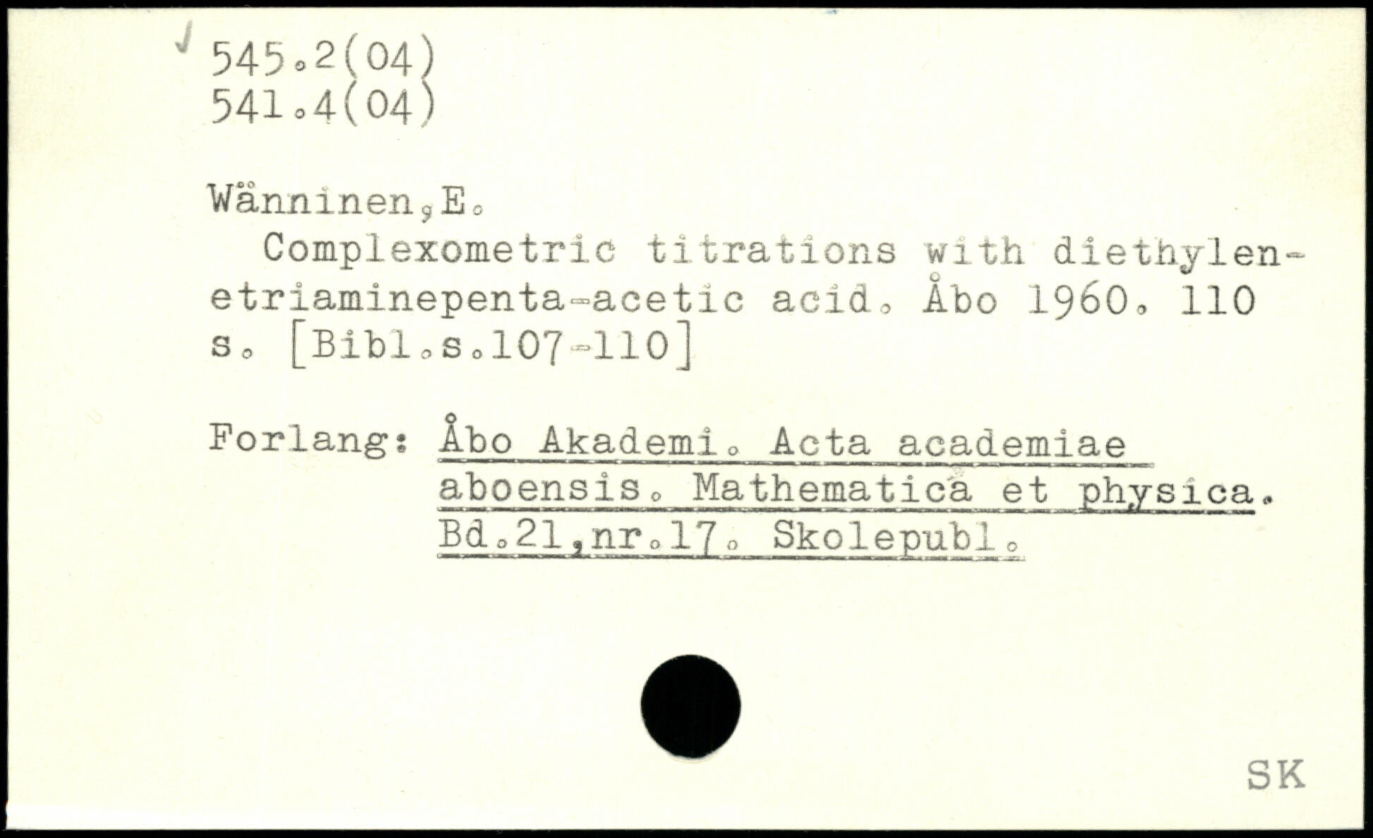 Wanmneiij E, Complexometric titrations with diethylen-etriaminepenta-acetic acid., Abo 1960