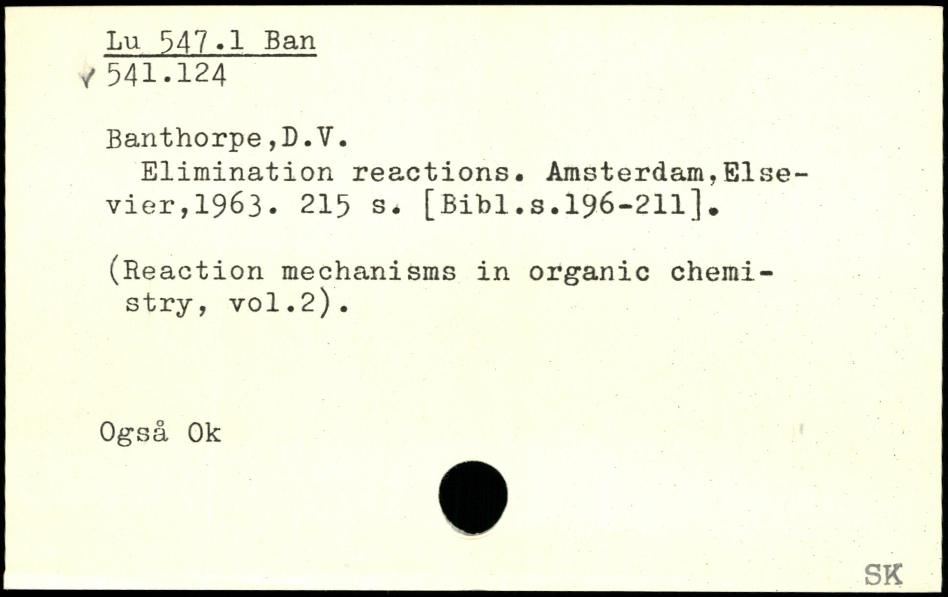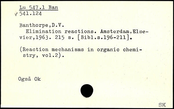 Elimination reactions, Amsterdam,Elsevier, 1963. 215 s. [Bibl.s.196-211]. (Reaction mechanisms in organic chemistry, vol.2). Ogsa Ok