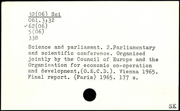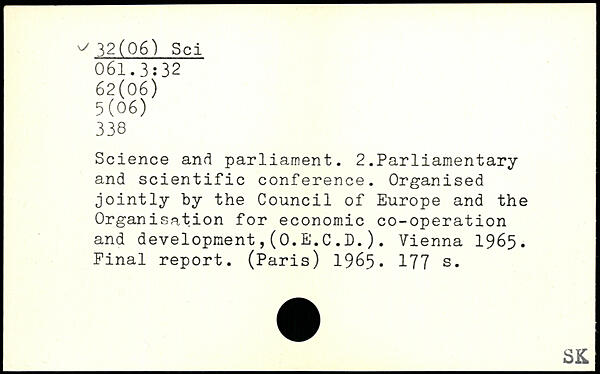 Science and parliament. 2.Parliamentary and scientific conference. Organised jointly by the Council of Europe and the Organisation for economic co-operation and development,(O.E.C.D.). Vienna 1965. Pinal report. (Paris) 1965.