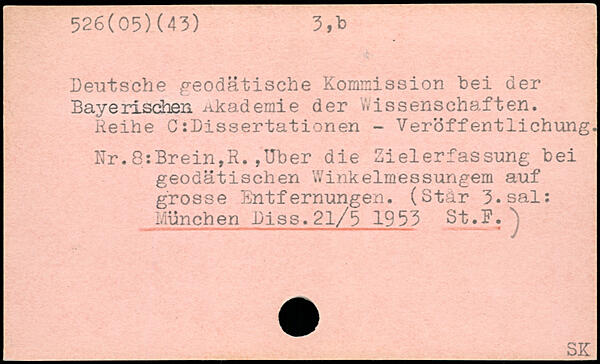 Deutsche geodätische Kommission bei der Bayerischen Akademie der Wissenschaften. Reihe CiDissertationen - Veröffentlichung. Nr.8:Brein,R.,Uber die Sielerfassung bei geodätischen Winkelmessungem auf grosse Entfernungen. (Stär ö.sal: München Piss.21/5