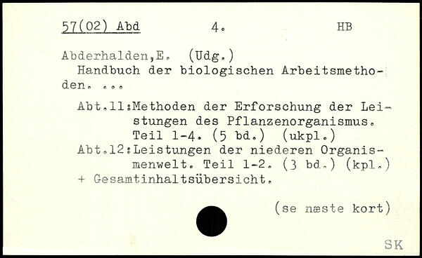Abderhalden,E, (üdg.) Handbuch der biologischen Arbeitsmethoden,. ,, Abt,11sMethoden der Erforschung der Leistungen des Pflanzenorganismus, Teil 1-4. (5 bd.) (ukpl.) Abt,12tLeistungen der niederen Organismenwelt. Teil 1-2. (3 bd.) (kpl,) + Gesamtinhaltsübersicht,