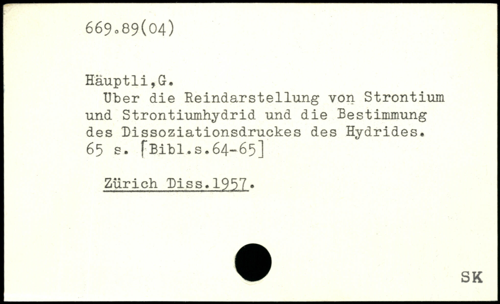 Uber die Heindarstellung von Strontium und Strontiumhydrid und die Bestimmung des Dissoziationsdruckes des Hydrides. 65 e. fBibi.s.64-65] Zürich Piss.1957