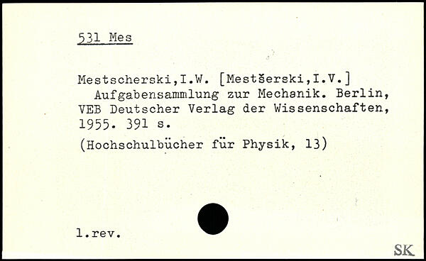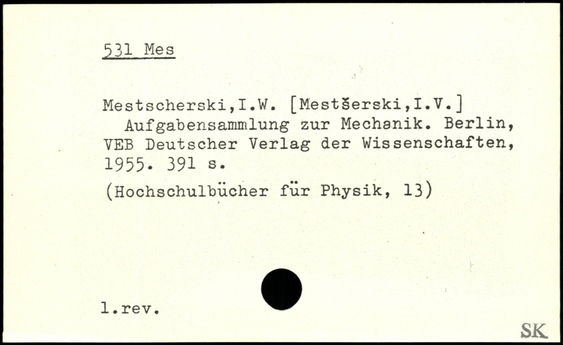 Mestscherski,I.W. [Mest§erski,I.V.] Aufgabensammlung zur Mechanik. Berlin, VEB Deutscher Verlag der Wissenschaften, 1955-