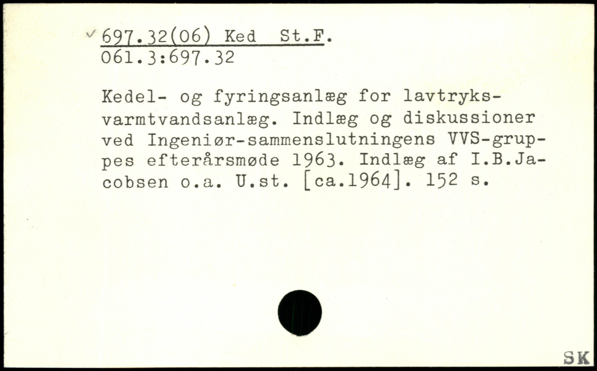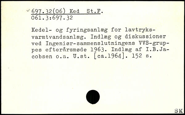 Kedel- og fyringsanlæg for lavtryks-varmtvandsanlæg. Indlæg og diskussioner ved Ingeniør-sammenslutningens VVS-grup-pes efterårsmøde 1963, Indlæg af I.B.Jacobsen o.a. U.st. [ca.1964].