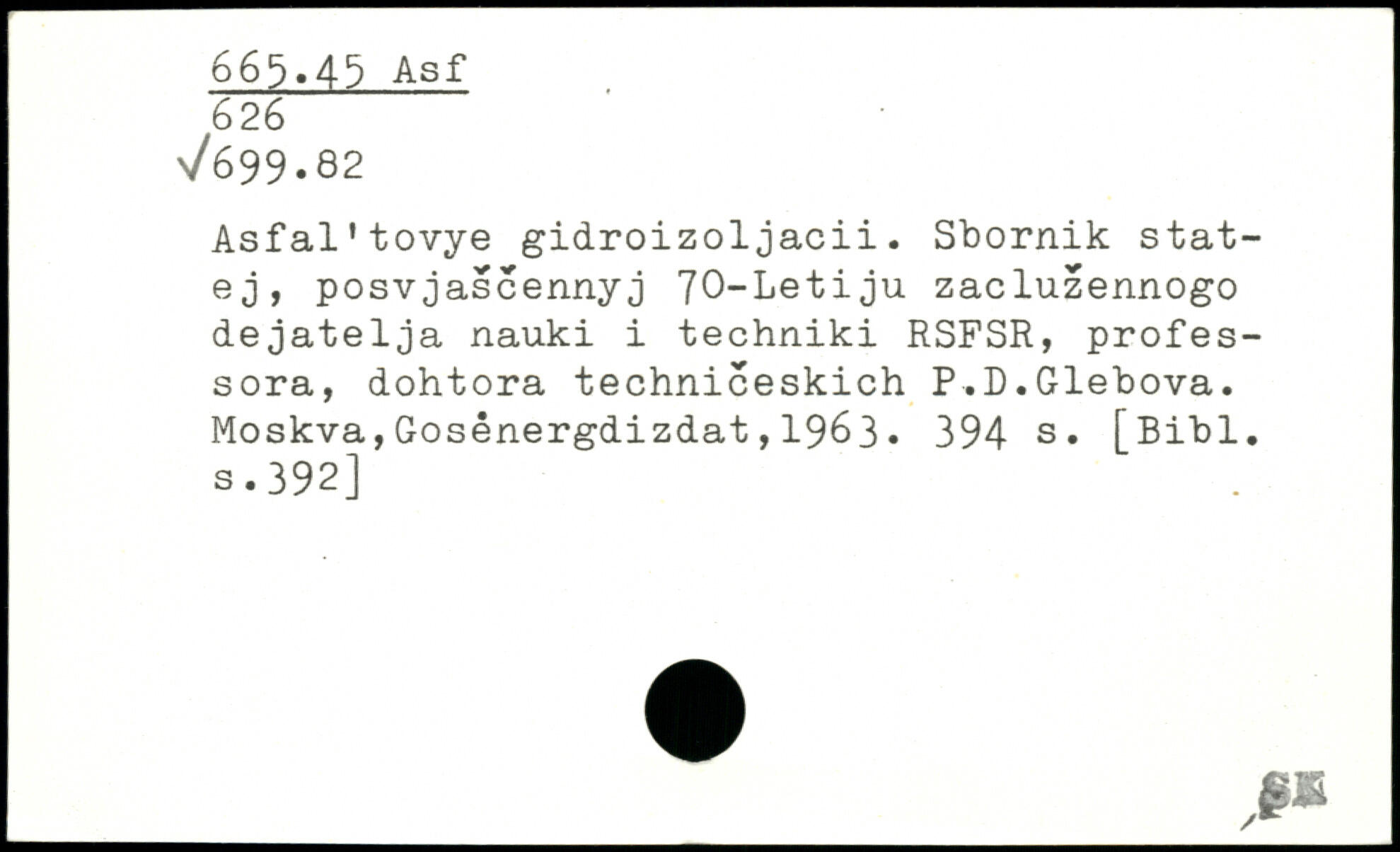 Asfal'tovye gidroizoljacii. Sbornik stat-ej, posvjascennyj 70-Letiju zacluzennogo dejatelja nauki i techniki RSFSR, profes-sora, dohtora techniceskich P.D.Glebova. Moskva,Gosênergdizdat,1963.