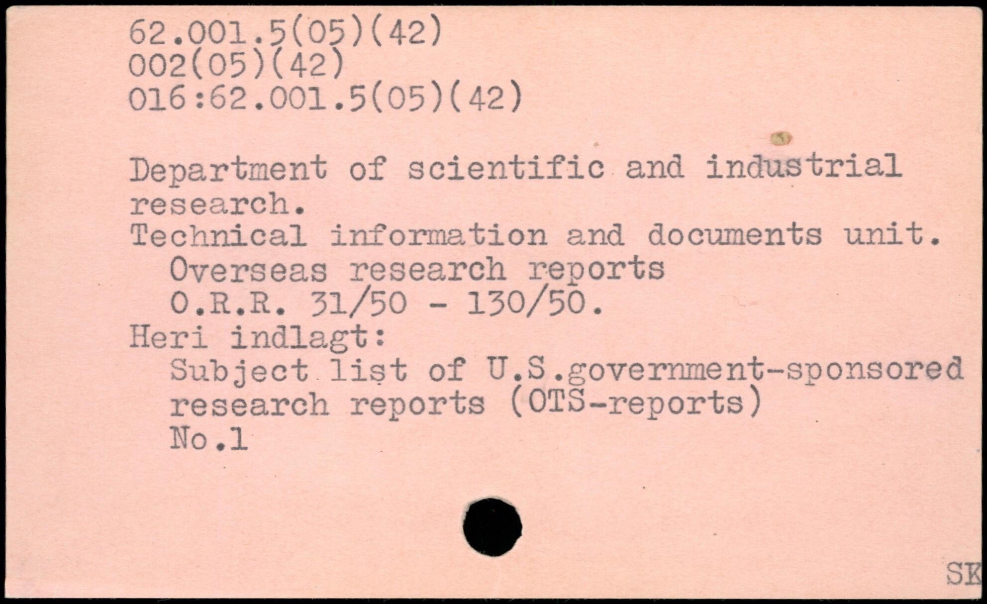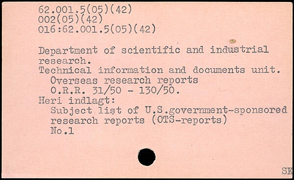 Department of scientific and industrial research. Technical information and documents unit. Overseas research reports O.R.R. 31/50 - 130/50. Heri indlagt: Subject list of U.S.government-sponsored research reports (OTS-reports) Ko.l