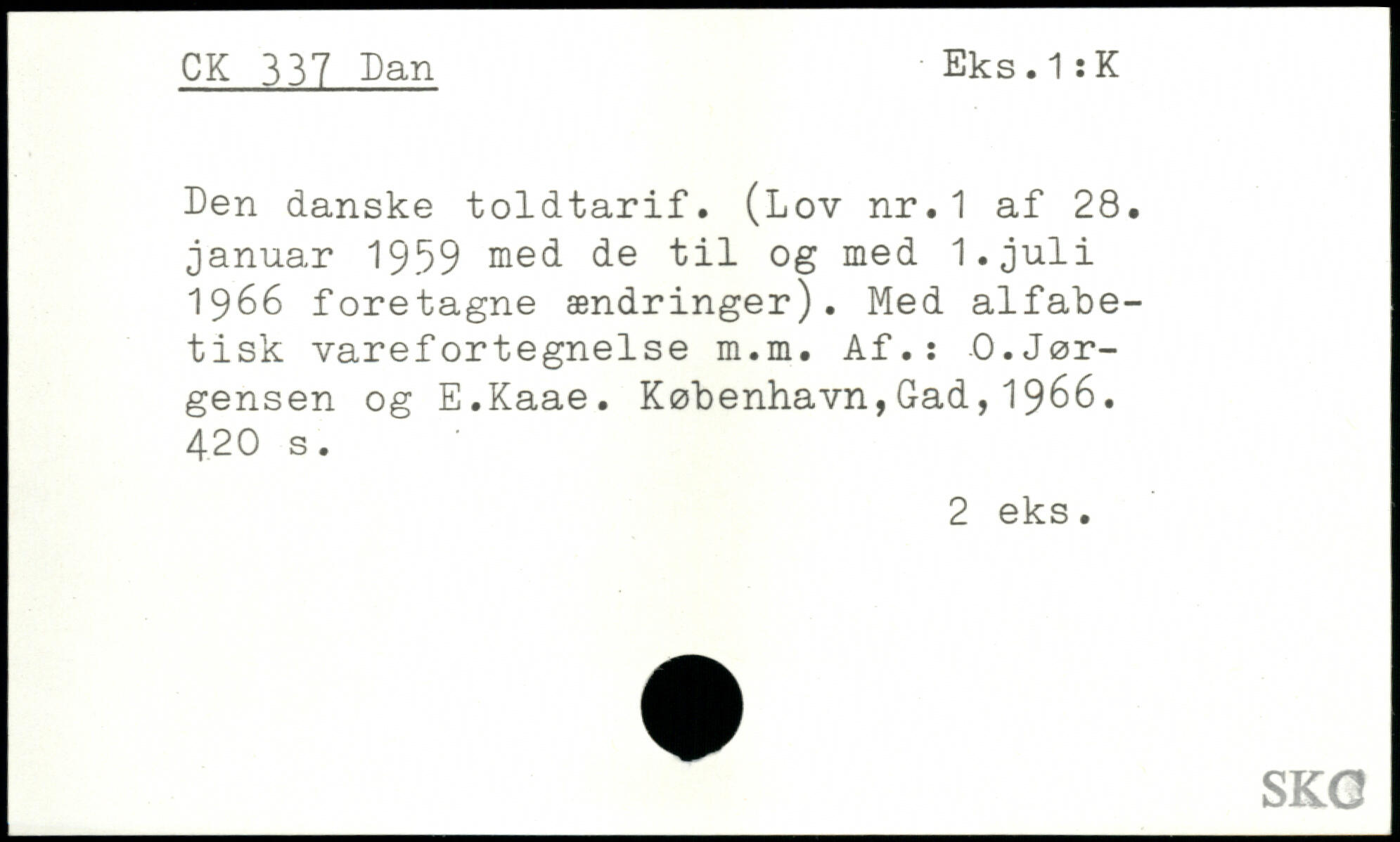 Den danske toldtarif. (Lov nr.1 af 28. januar 1959 med de til og med l.juli 1966 foretagne ændringer). Med alfabetisk varefortegnelse m.m. Af.: 0.Jørgensen og E.Kaae.