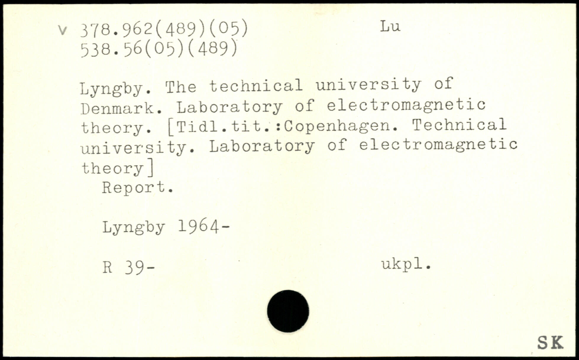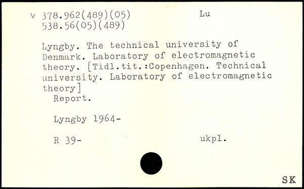Lyngby. The technical university of Denmark. Laboratory of electromagnetic theory. [Tidl.titCopenhagen. Technical university. Laboratory of electromagnetic theory] Report. Lyngby 1964- R 39- ukpl.