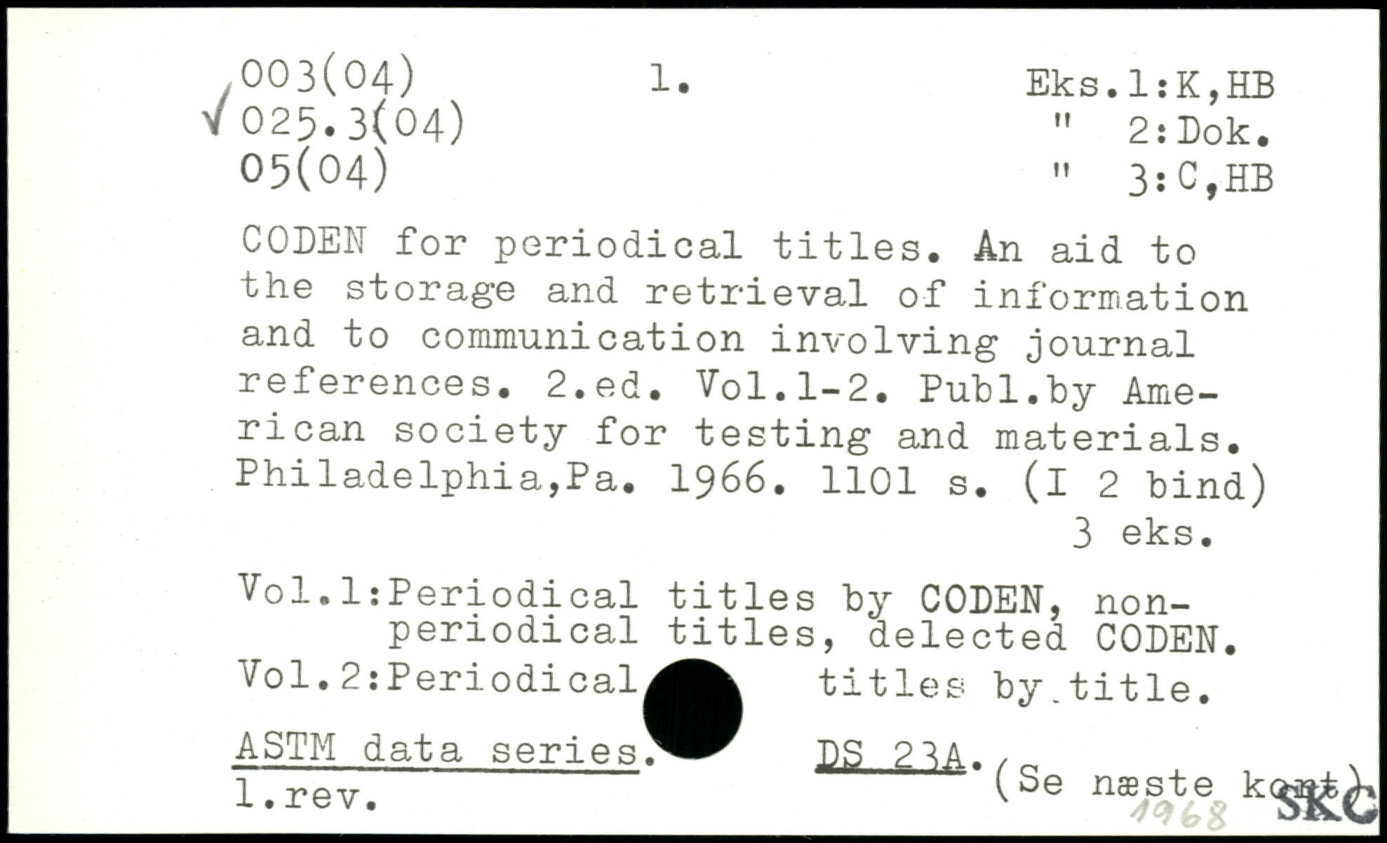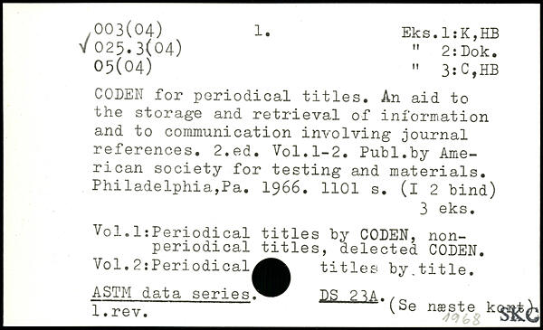 CODEN for periodical titles. An aid to the storage and retrieval of information and to communication involving journal references.