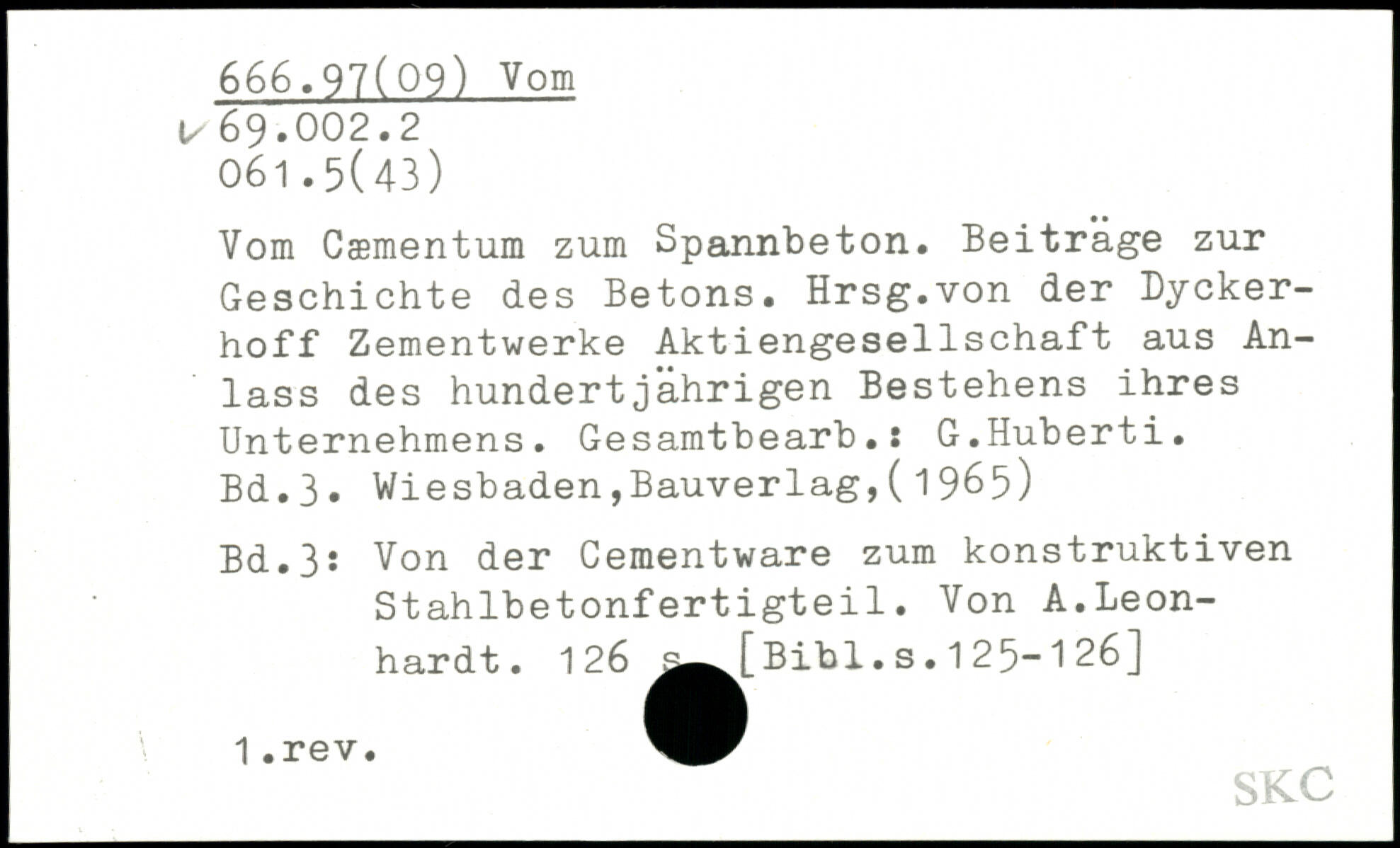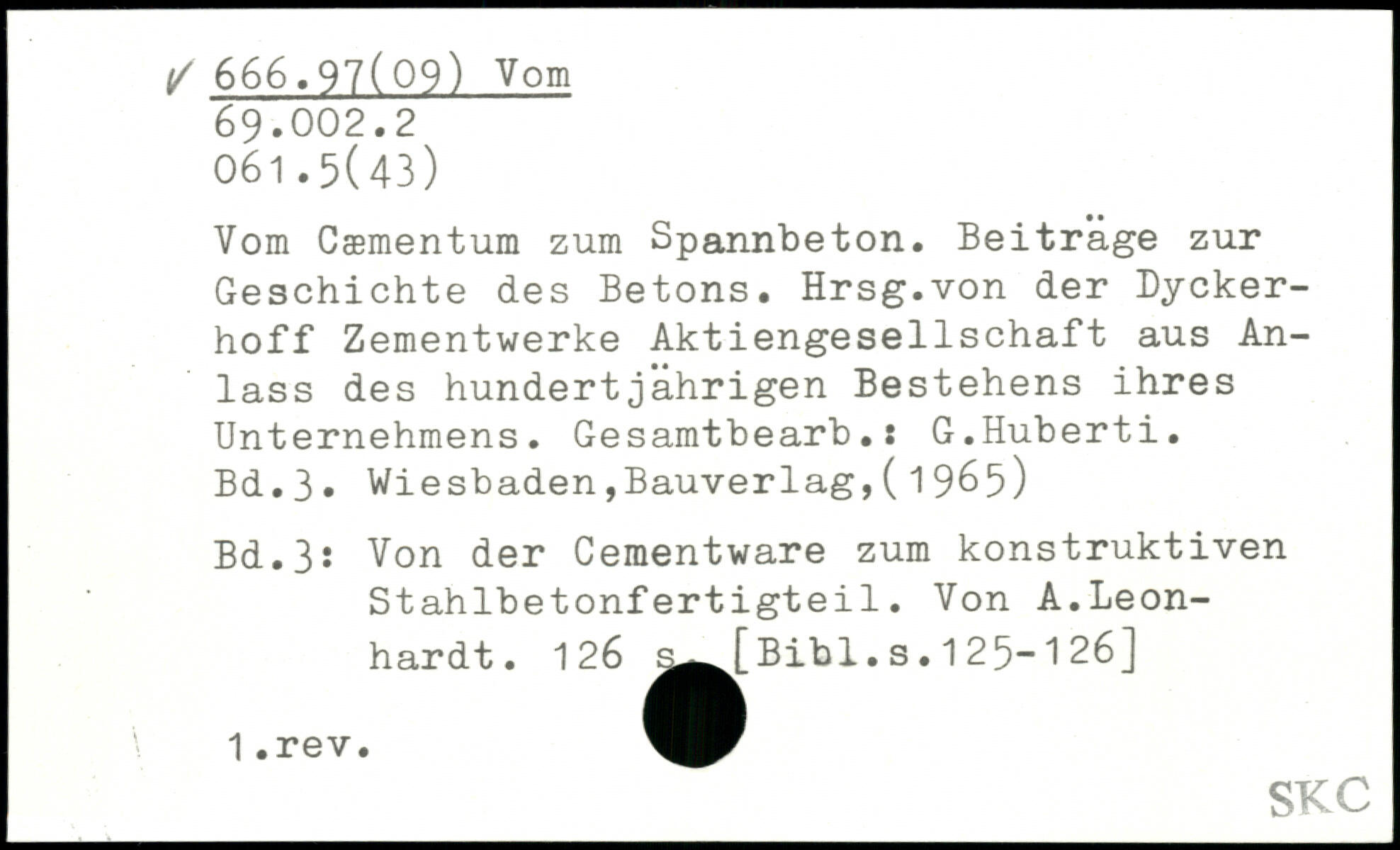 Vom Caementum zum Spannbeton. Beitrage zur Geschichte des Betons. Hrsg.von der Dyckerhoff Zementwerke Aktiengesellschaft aus Anlass des hundert jährigen Bestehens ihres Unternehmens. Gesamtbearb.: G.Huberti.