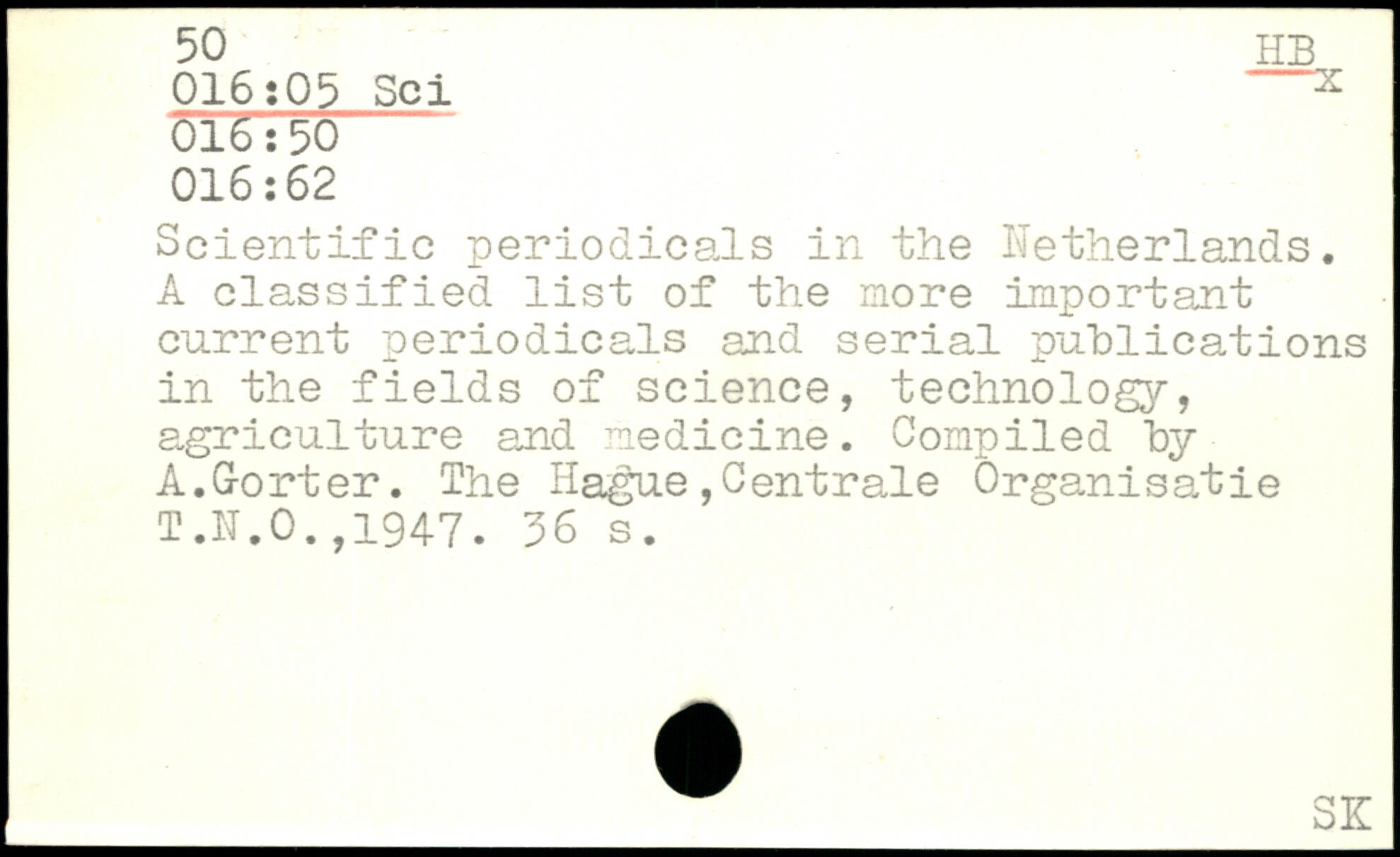 Scientific periodicals in the Netherlands. A classified list of the more important current periodicals and serial publications in the fields of science, technology, agriculture and medicine. Compiled by A.G-orter. The Hague ,0entrale Organisatie T.N.O.,1947.