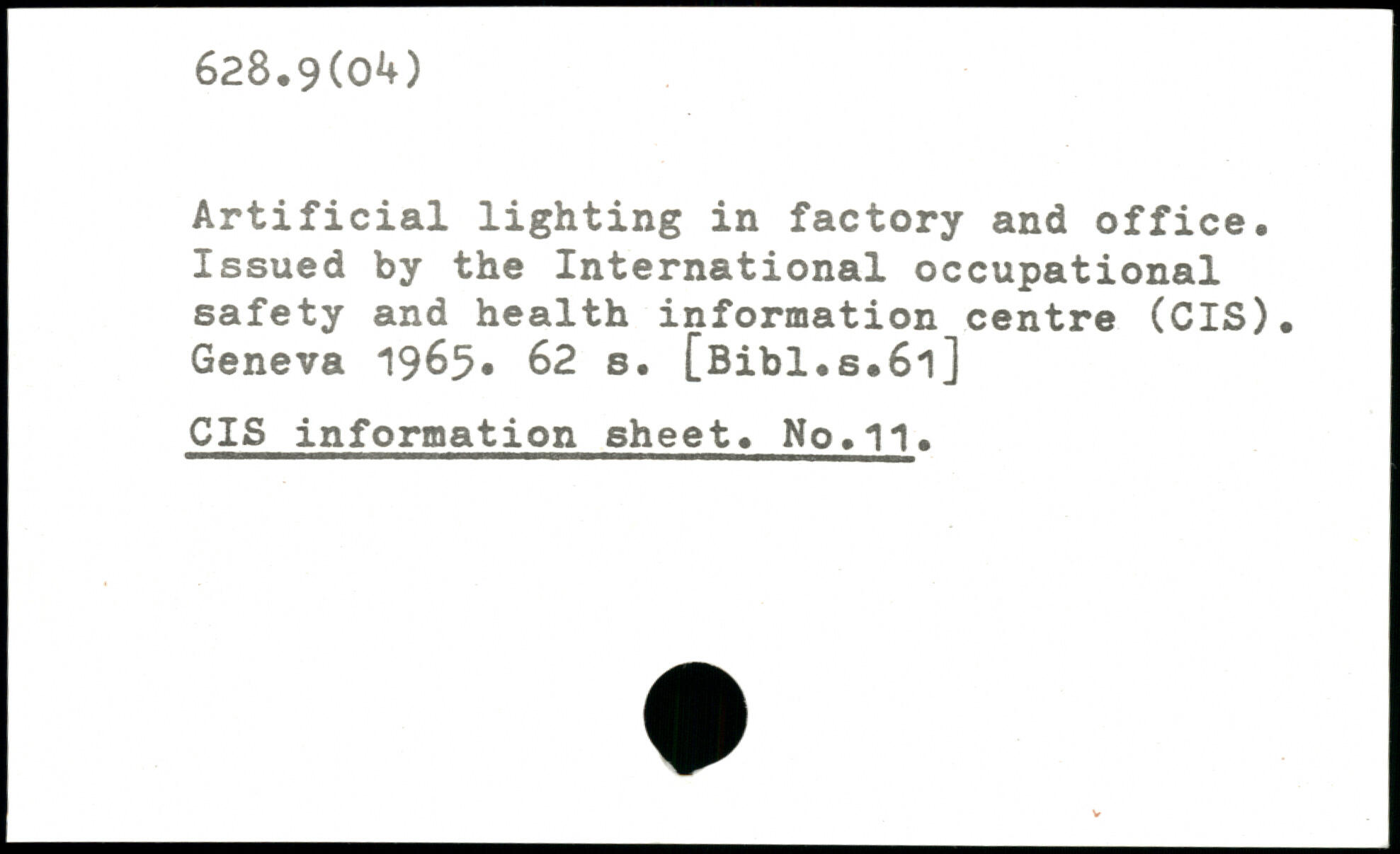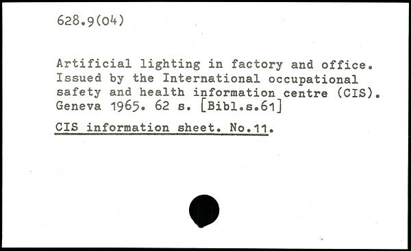 Artificial lighting in factory and office. Issued by the International occupational safety and health information centre (CIS).