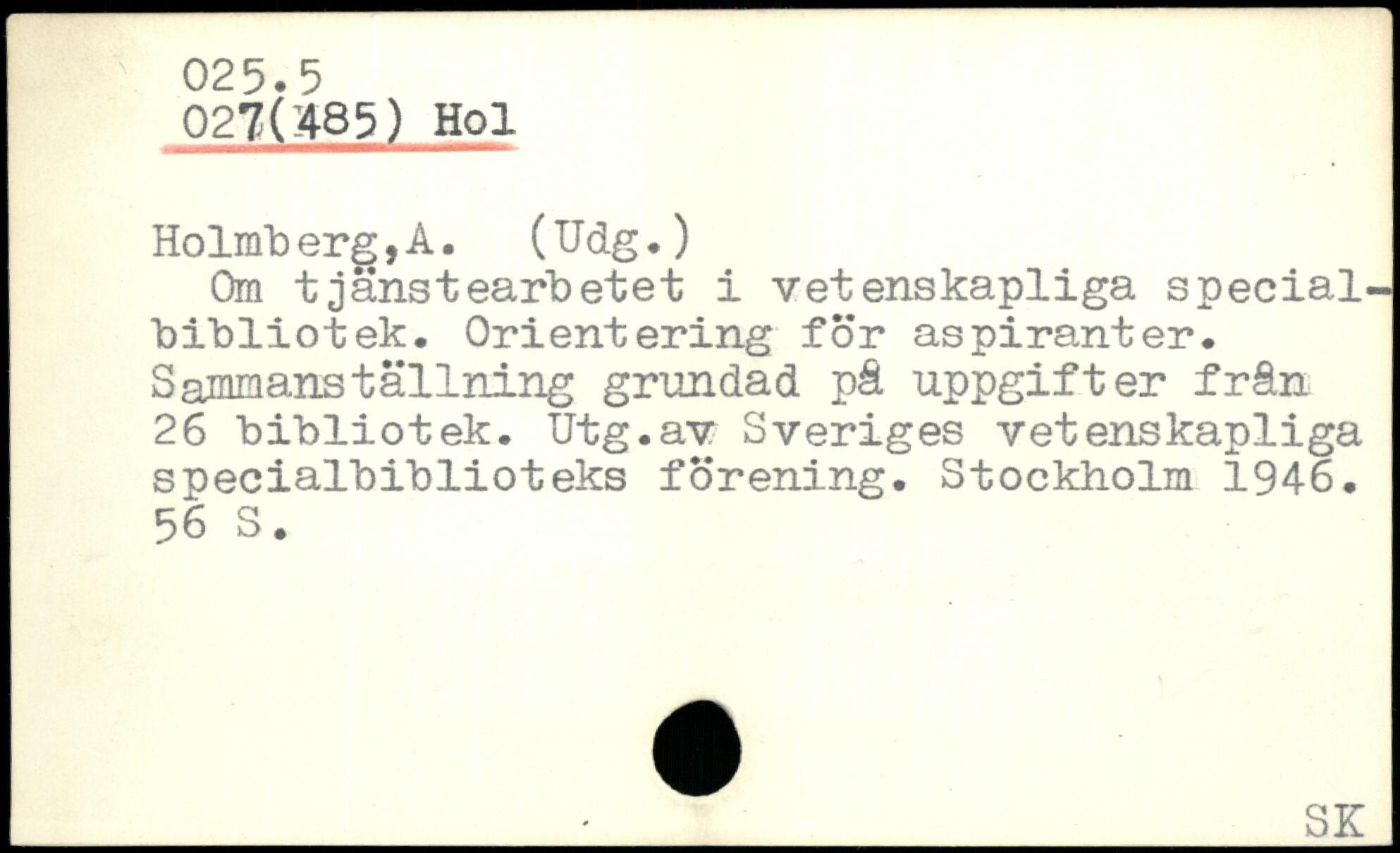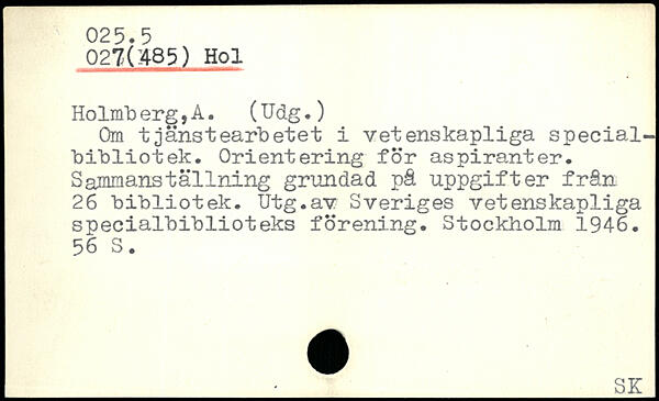Holmb erg,A. (Udg.) Om tjänstearbetet i vetenskapliga specialbibliotek. Orientering for aspiranter. Sajnmanställning grundad på uppgifter från 26 bibliotek. Utg.av Sveriges vetenskapliga specialbiblioteks forening.