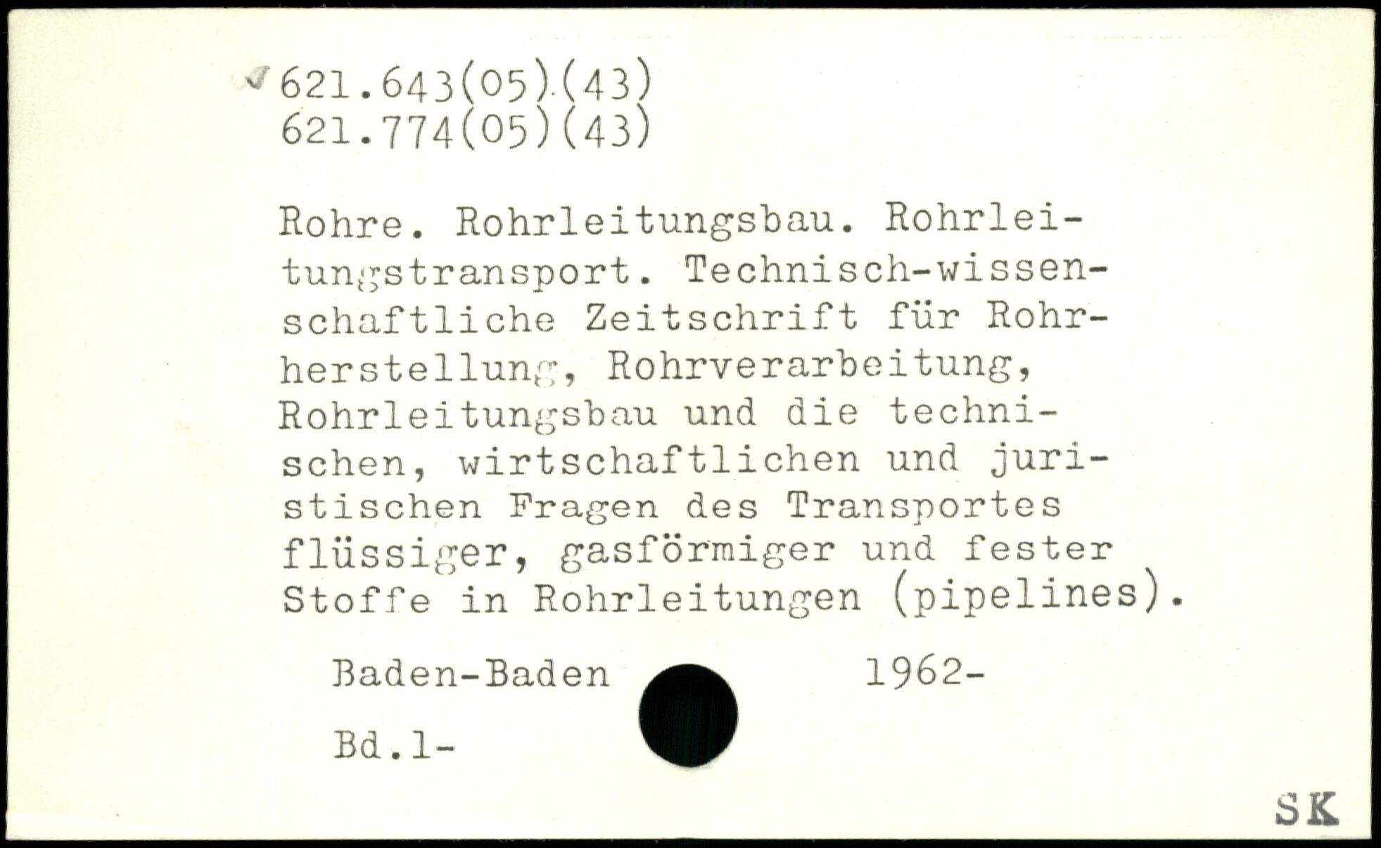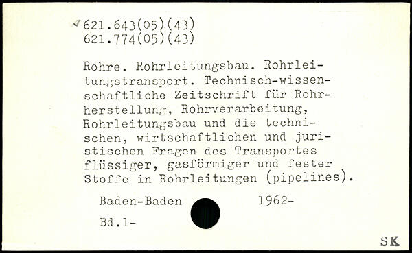 Rohre. Rohrleitungsbau. Rohrleitungstransport. Technisch-wi ssen-schaftliche Zeitschrift für Rohrherstellung, Rohrverarbeitung, Rohrleitungsbau und die technischen, wirtschaftlichen und juristischen Fragen des Transportes flüssiger, gasförmiger und fester Stoffe in Rohrleitungen (pipelines). Baden-Baden 1962- Bd.l-