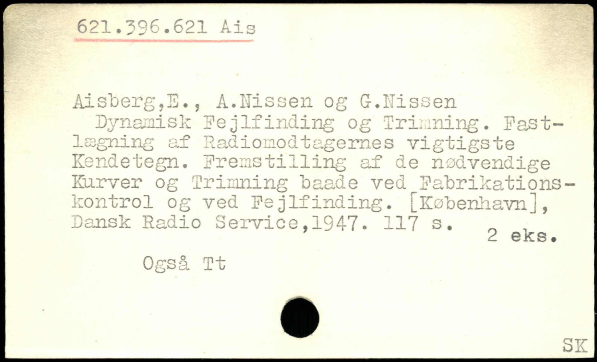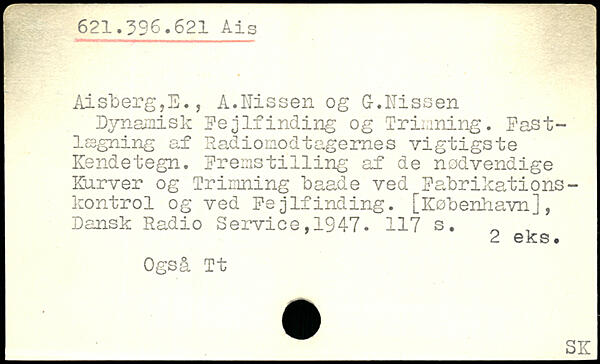 Dynamisk Fejlfinding og Trimning. Fastlægning af Radiomodtagernes vigtigste Kendetegn. Fremst1111ng af de nødvendige Karver og Trimning baade ved Fabrikations-kontrol og ved Fejlfinding. [København], Dansk Radio Service,1947.