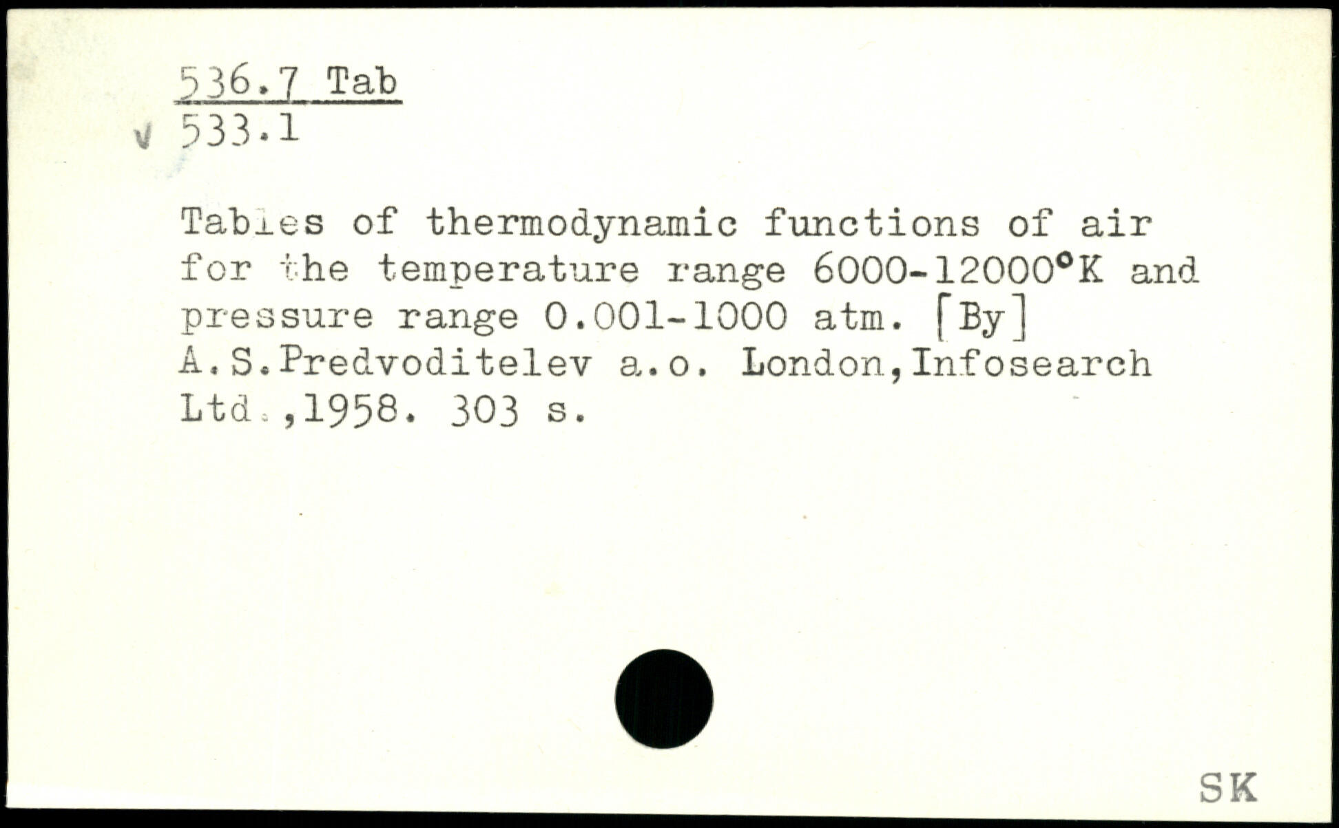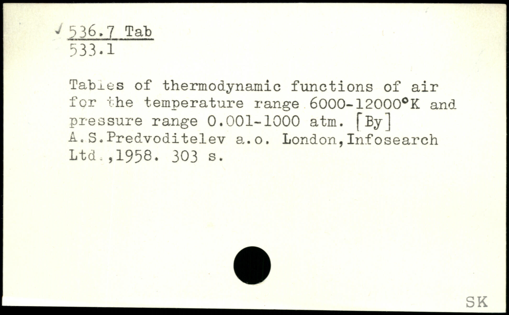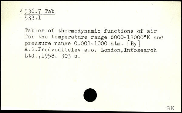 Tahres of thermodynamic functions of air for the temperature range 6000-12000.K and pressure range 0.001-1000 atm. [By] A.S.Predvoditelev a.o. London,Infosearch Ltd;,1958.