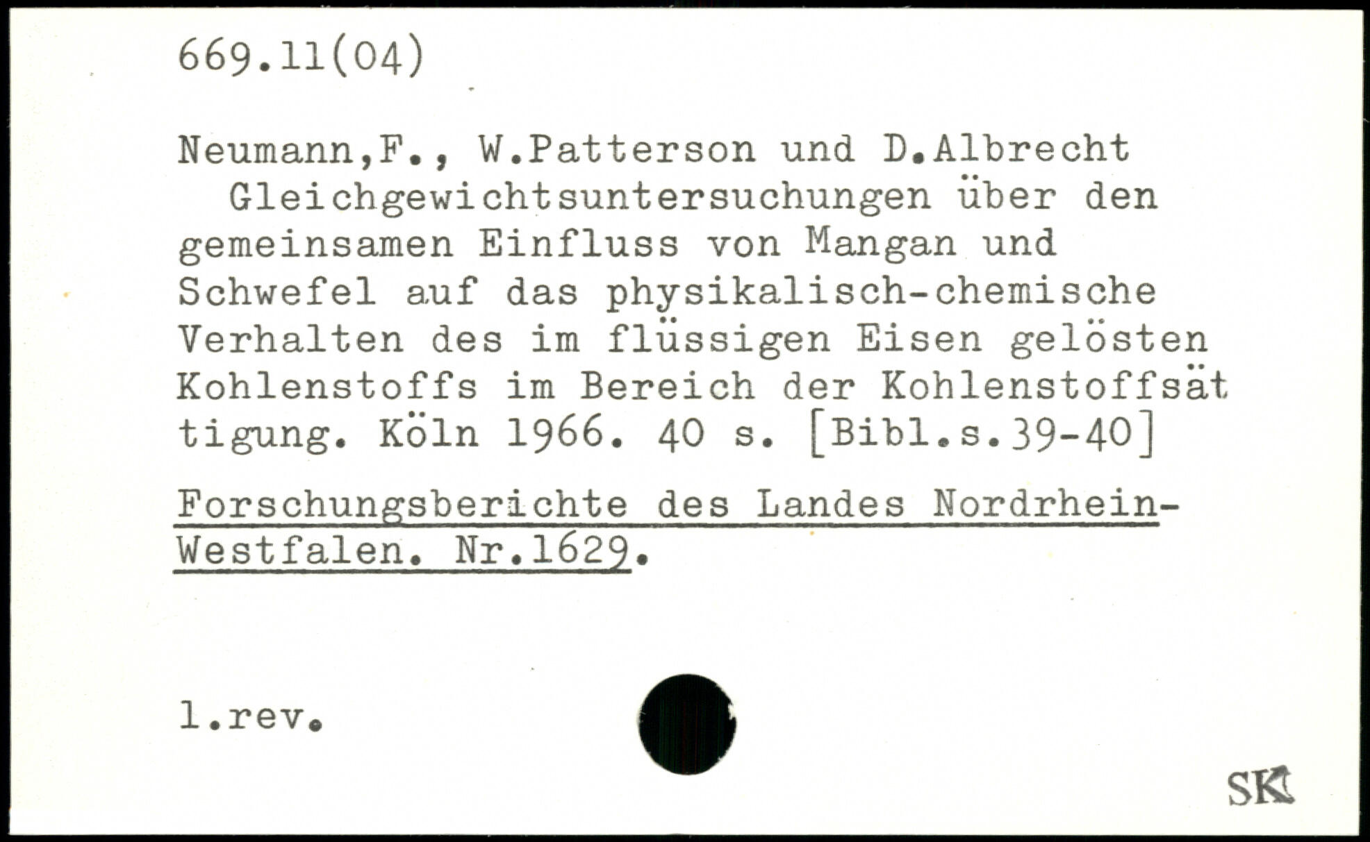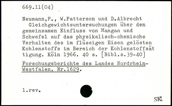 Neumann,F. , W.Patterson und. D.Albrecht Gleichgewichtsuntersuchungen über den gemeinsamen Einfluss von Mangan und Schwefel auf das physikalisch-chemische Verhalten des im flüssigen Eisen gelösten Kohlenstoffs im Bereich der Kohlenstoffsät tigung.