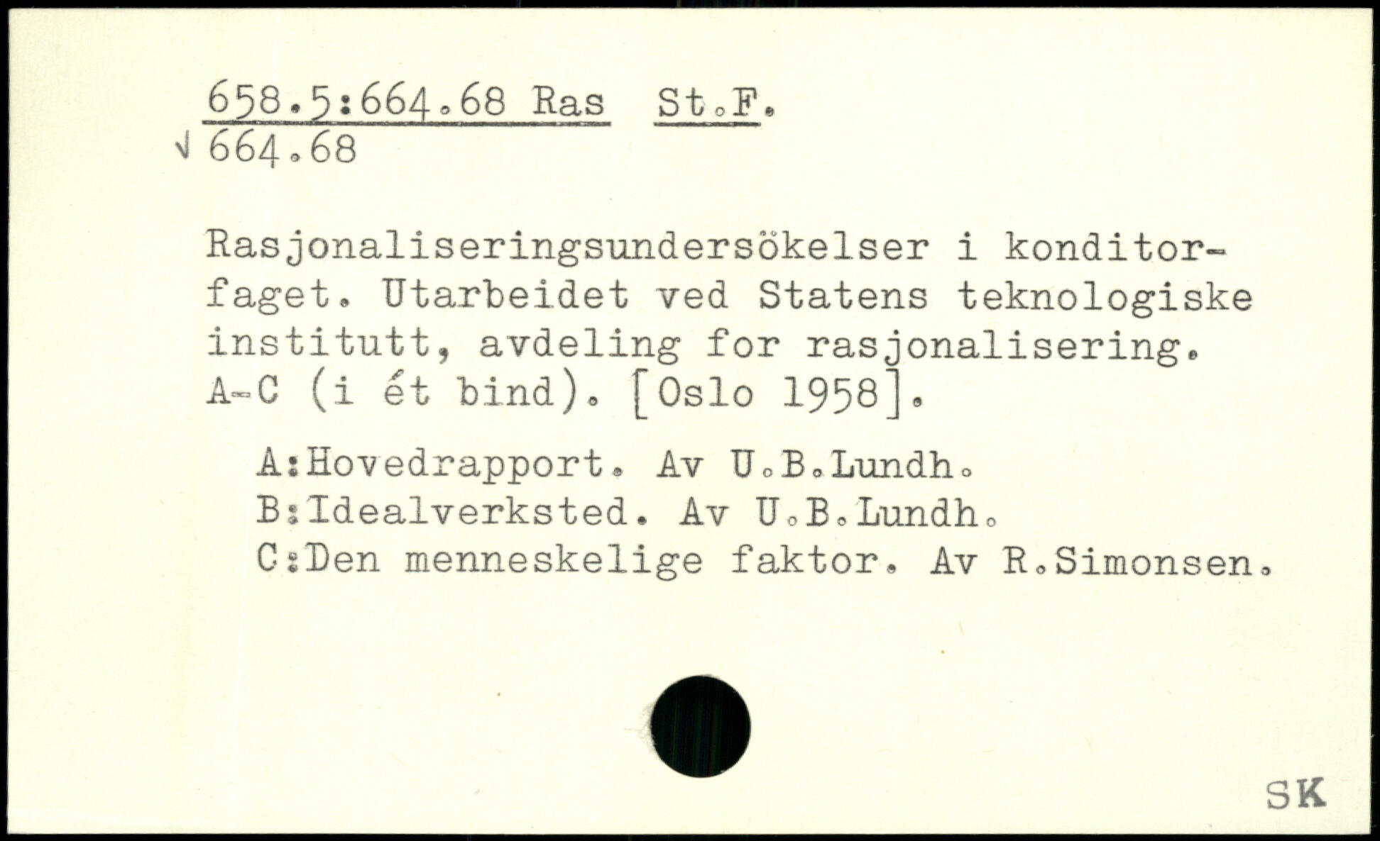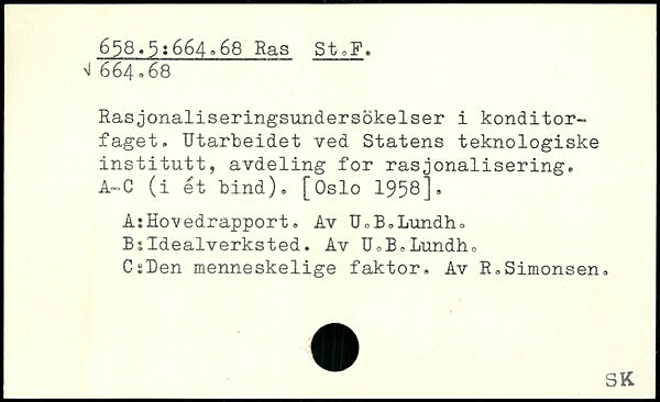 Rasjonaliseringsundersokelser i konditor-faget. Utarbeidet ved Statens teknologiske institutt, avdeling for rasjonalisering, A-C (i et bind). [Oslo 1958], A:Hovedrapport. Av UoB.Lundho Bsldealverksted. Av UoB.Lundho CsDen menneskelige faktor. Av R.Simonsen.