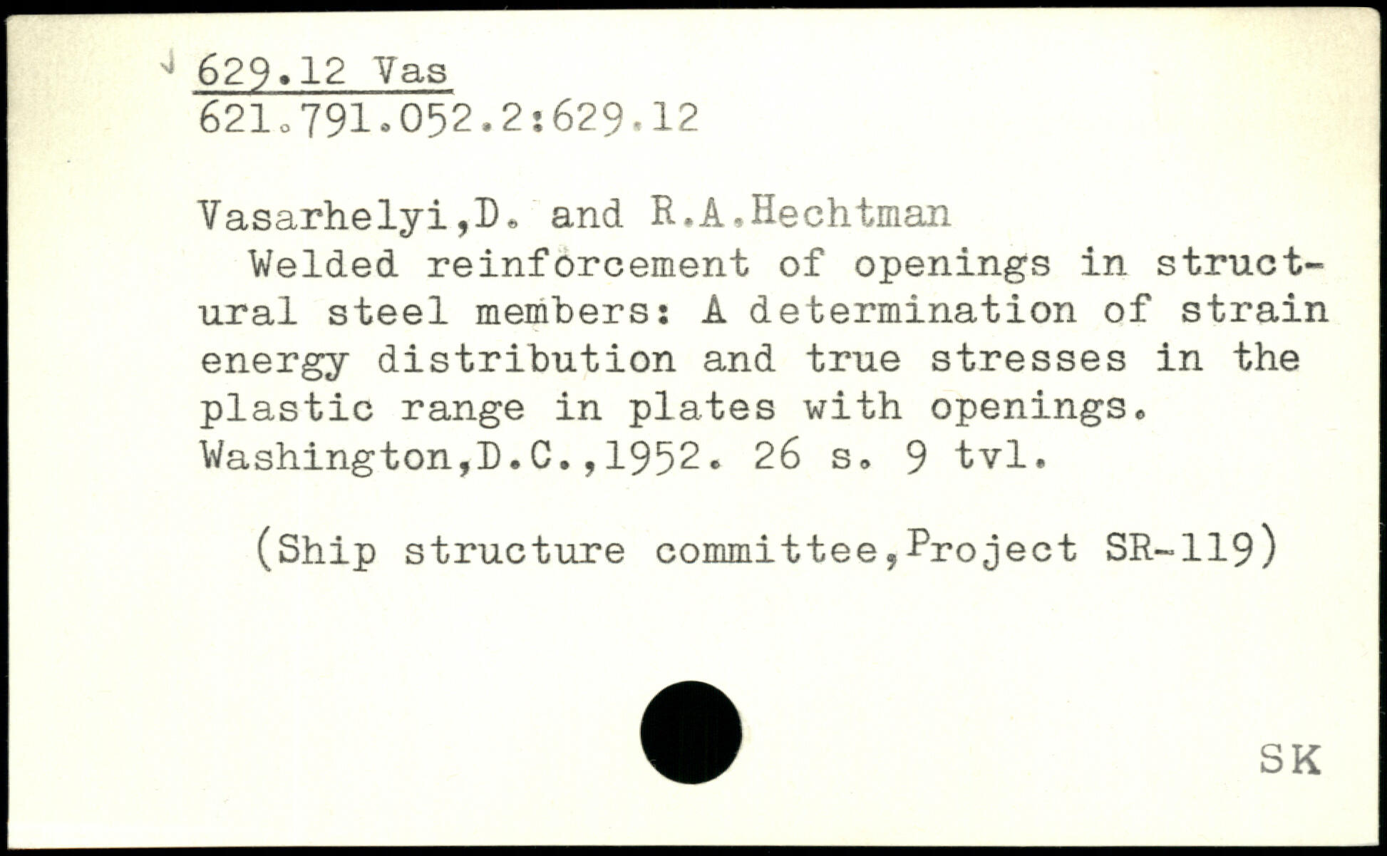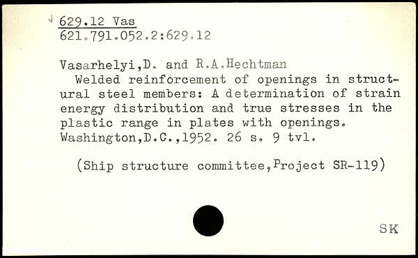 Welded reinforcement of openings in struct-ural steel members: A determination of strain energy distribution and true stresses in the plastic range in plates with openings. Washington,!). C., 1952.