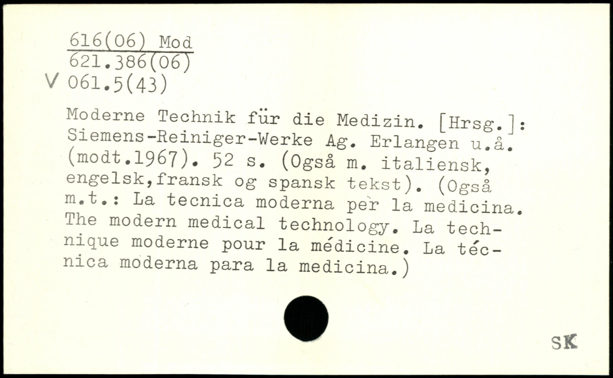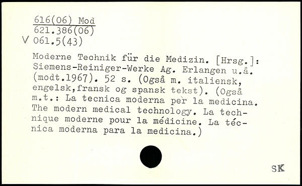 Moderne Technik für die Medizin. [Hrsg.]: oiemens-Reiniger-Werke Ag. Erlangen u.å. (modt.1967).