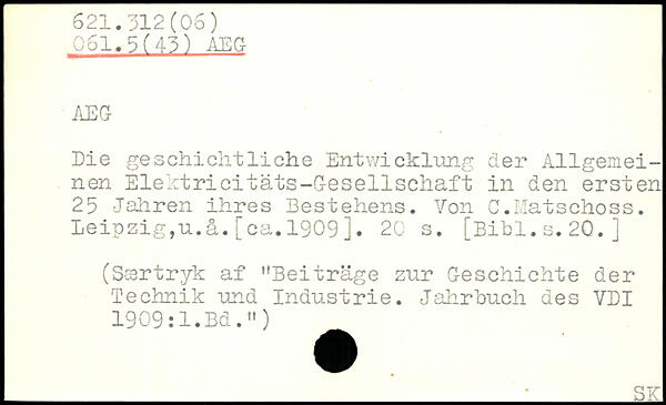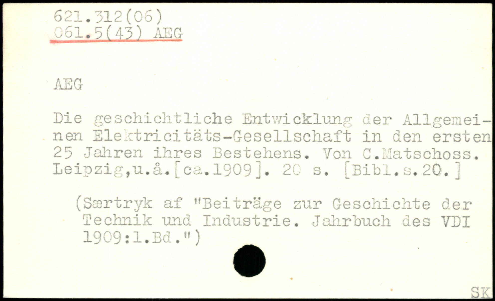 Die geschichtliche Entwicklung der Allgemeinen Elektricitäts-Gesellschaft in den ersten 25 Jahren ihres Bestehens. Von C.Matschoss. Leipzig,u.å.[ca.1909].