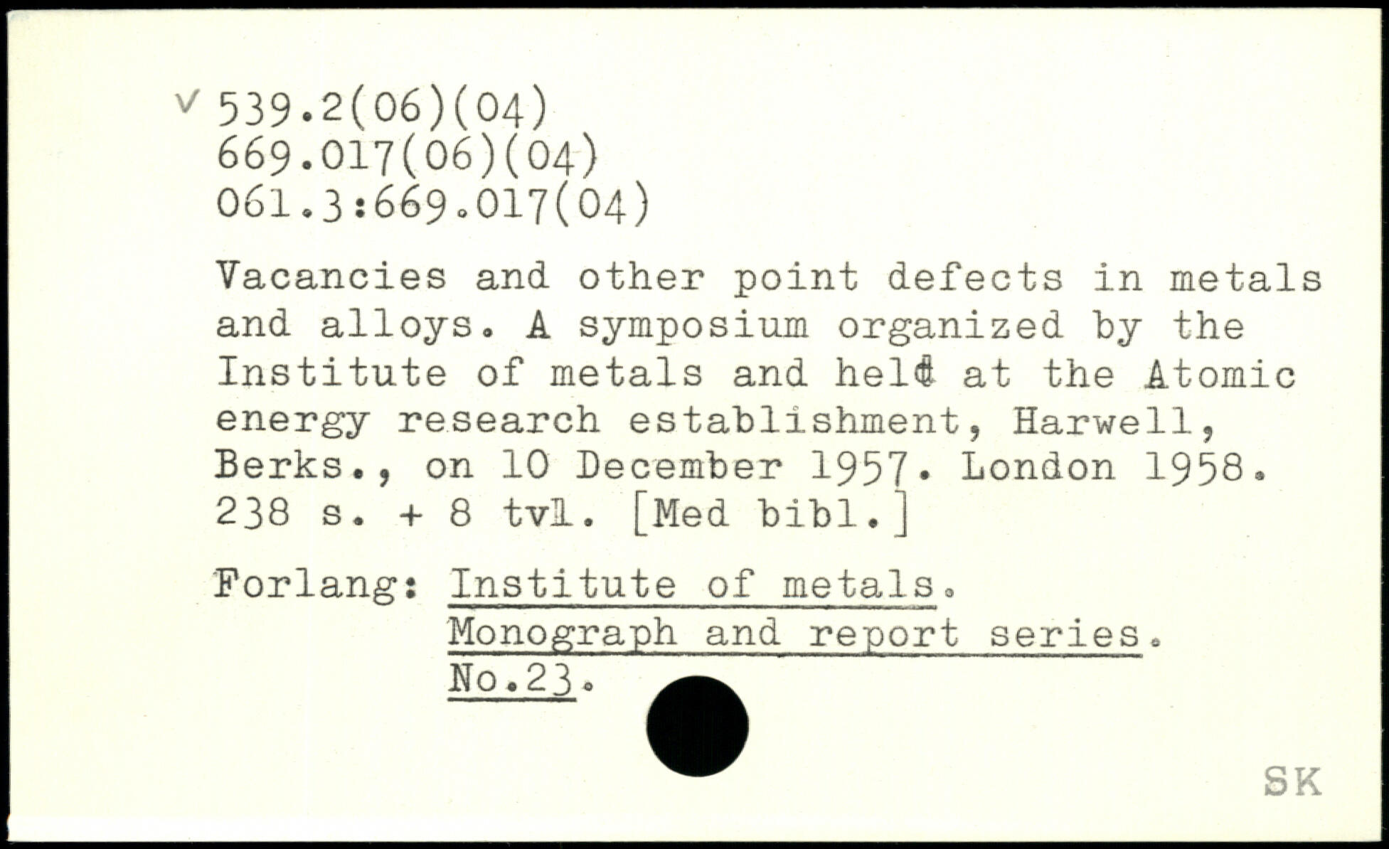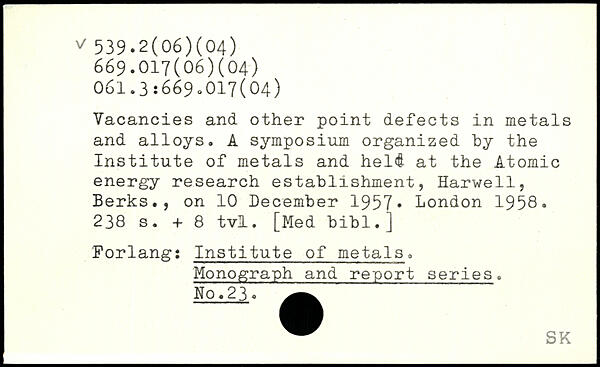Vacancies and other point defects in metals and alloys. A symposium organized hy the Institute of metals and held at the Atomic energy research establishment, Harwell, Berks., on 10 December 1957
