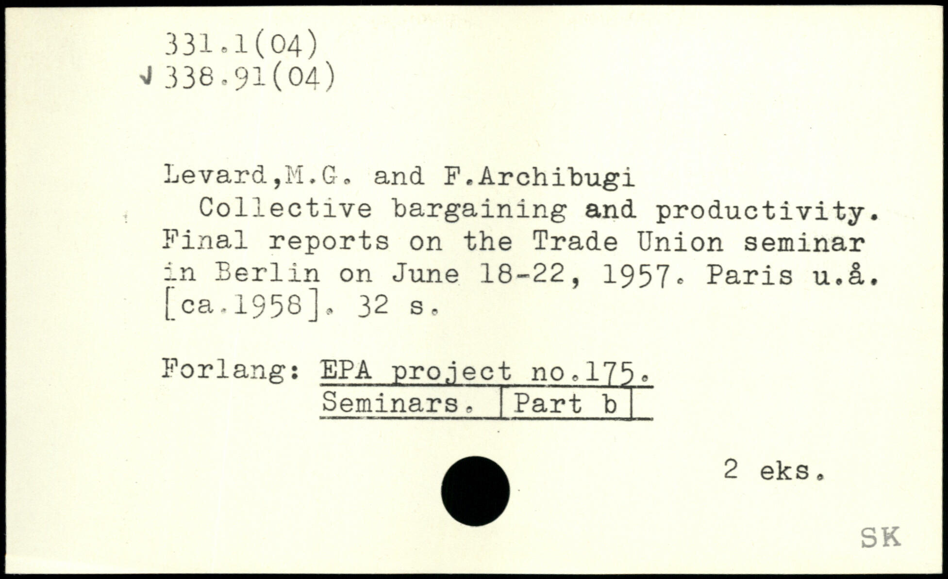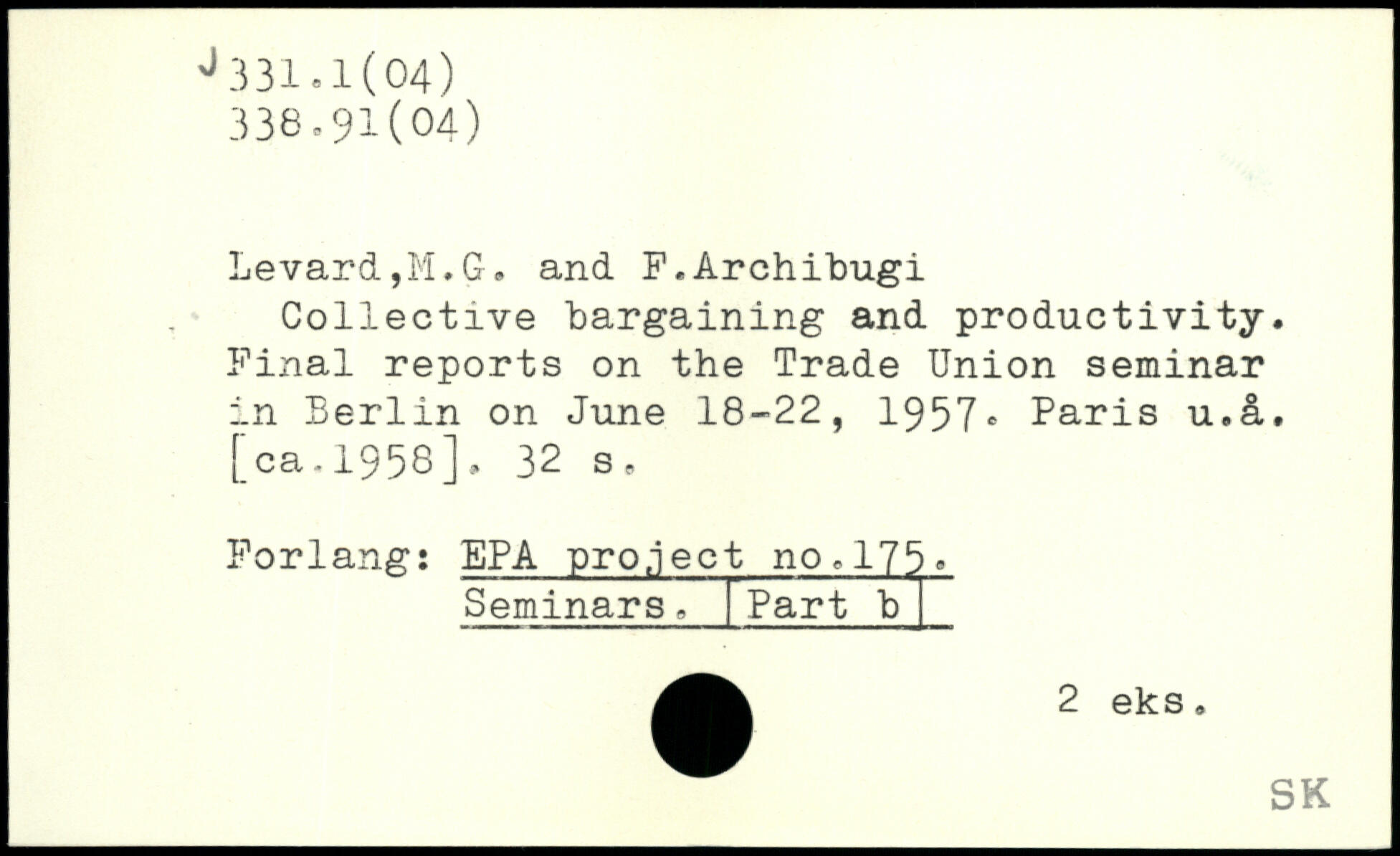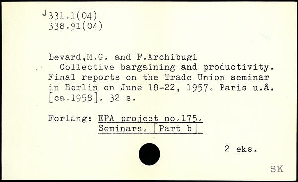 Collective bargaining and productivity. Final reports on the Trade Union seminar in Berlin on June 18-22, 1957, Paris u.&.