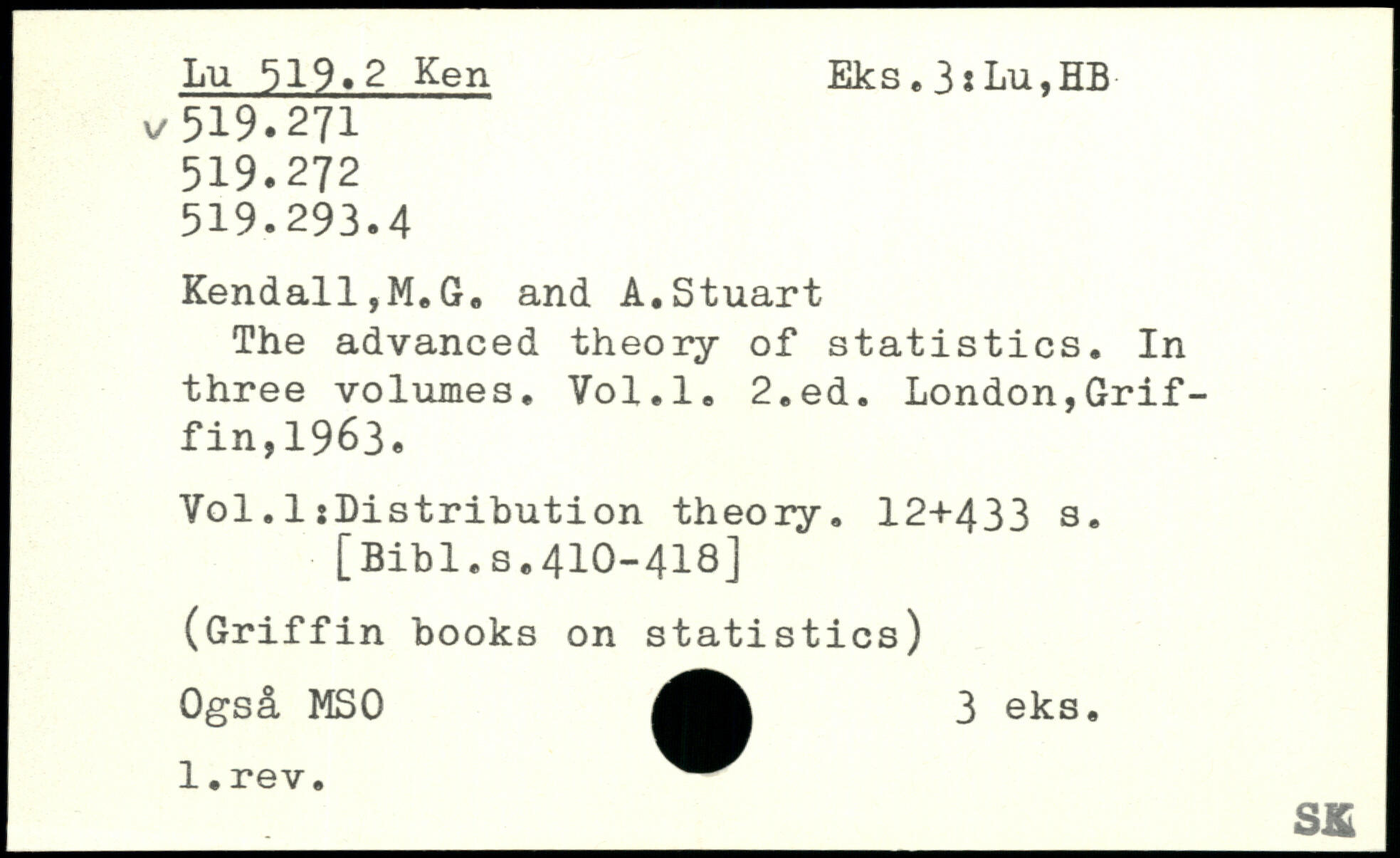 Kendall,M.G, and A.Stuart The advanced theory of statistics. In three volumes.