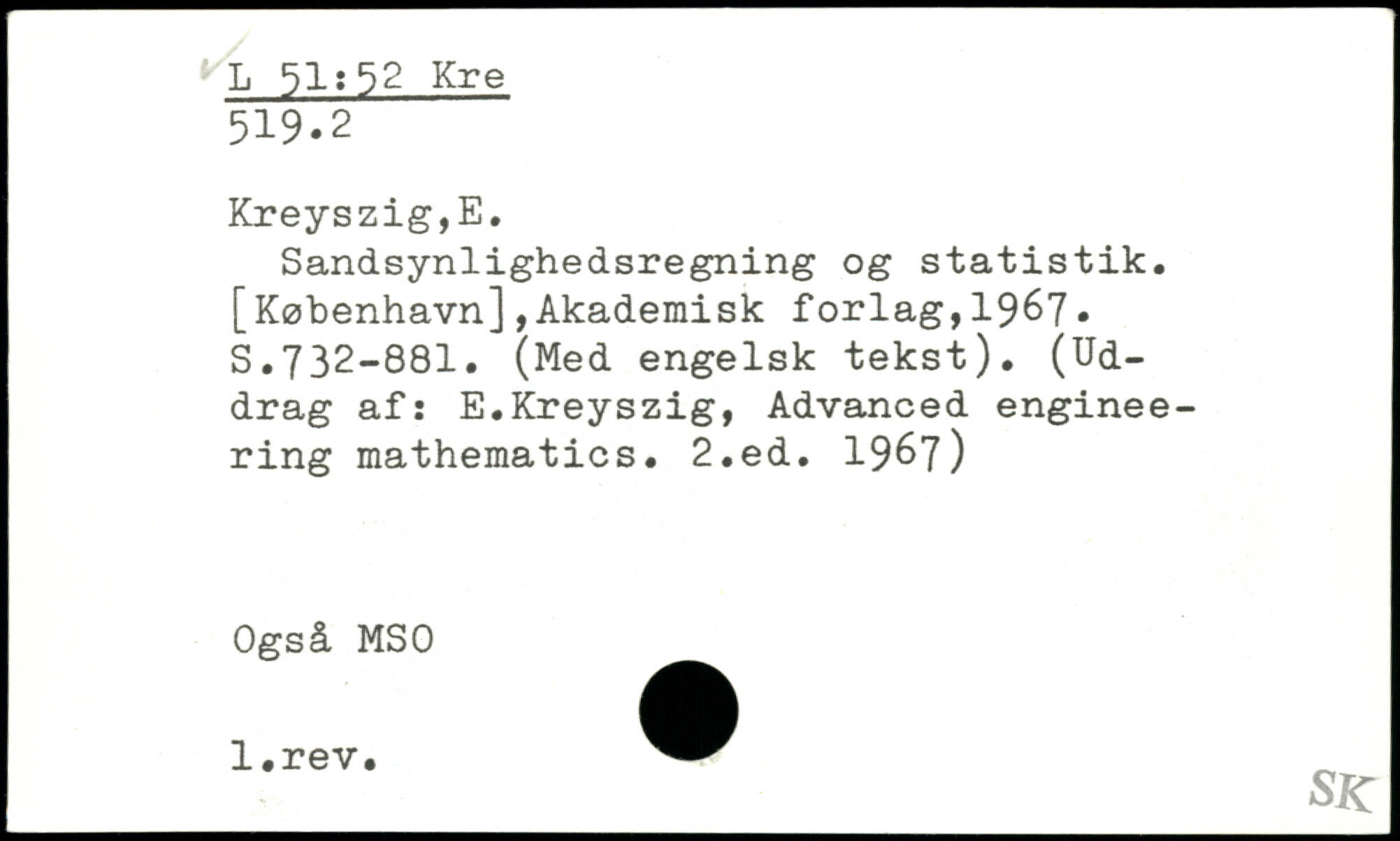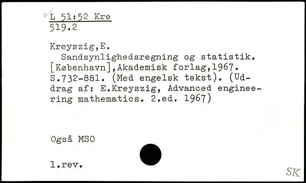 Sandsynlighedsregning og statistik. [København],Akademisk forlag,19&7. S.732-881. (Med engelsk tekst). (Uddrag af: E.Kreyszig, Advanced engineering mathematics.