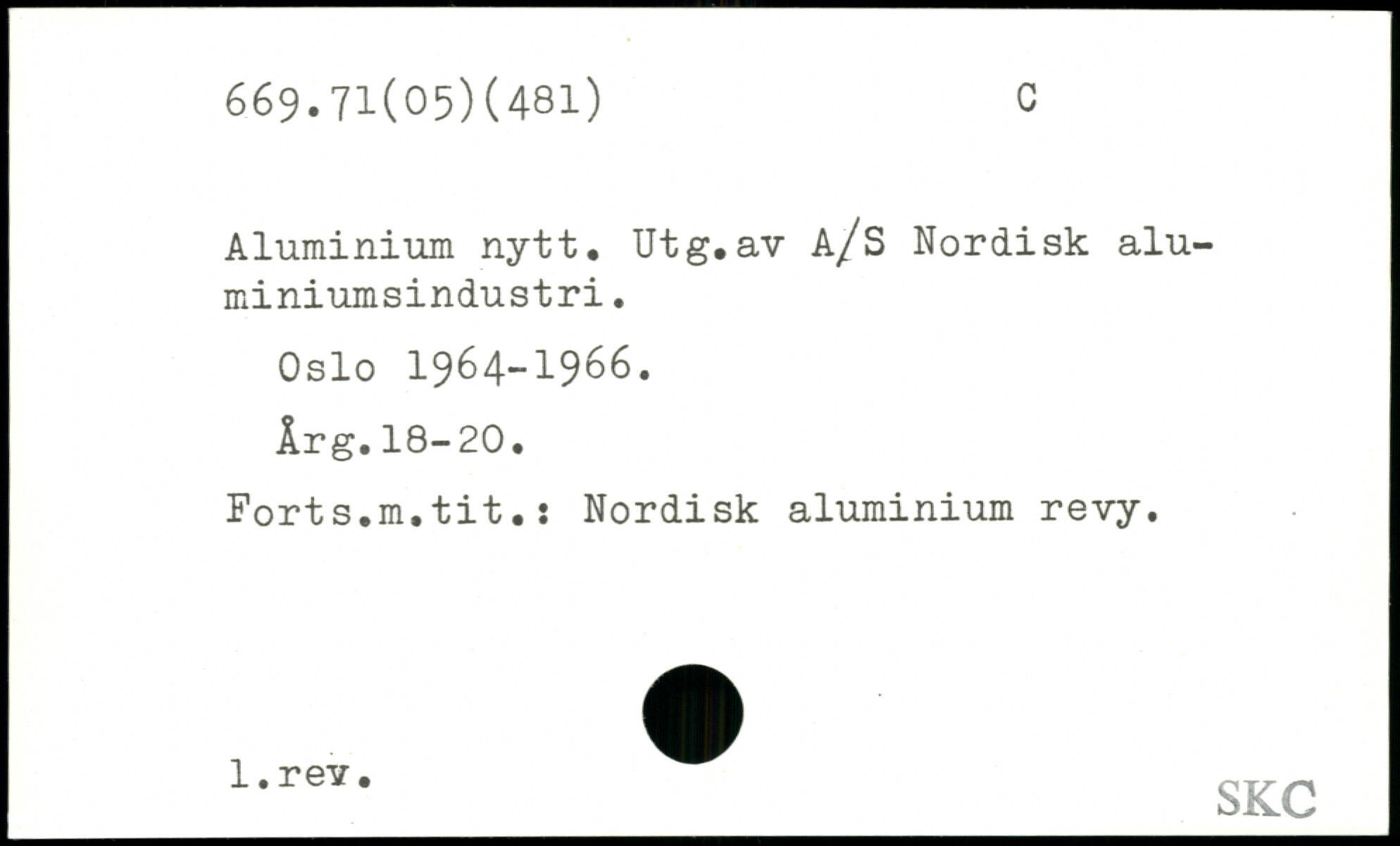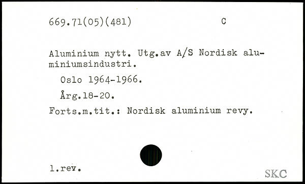 Aluminium nytt. Utg.av A/S Nordisk alu-miniumsindustri. Oslo 1964-1966. Årg.18-20. Forts.m.tit.: Nordisk aluminium revy. _1,rev‘_SKC