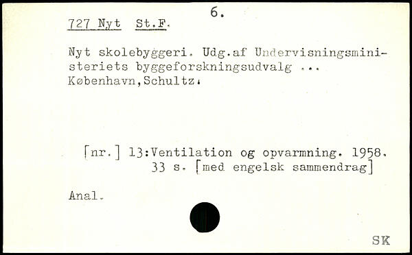 Nyt skolebyggeri. Udg.af Undervisningsministeriets byggeforskningsudvalg ... København,Schultz i !"nr.] 13:Ventilation og opvarmning. 1958'