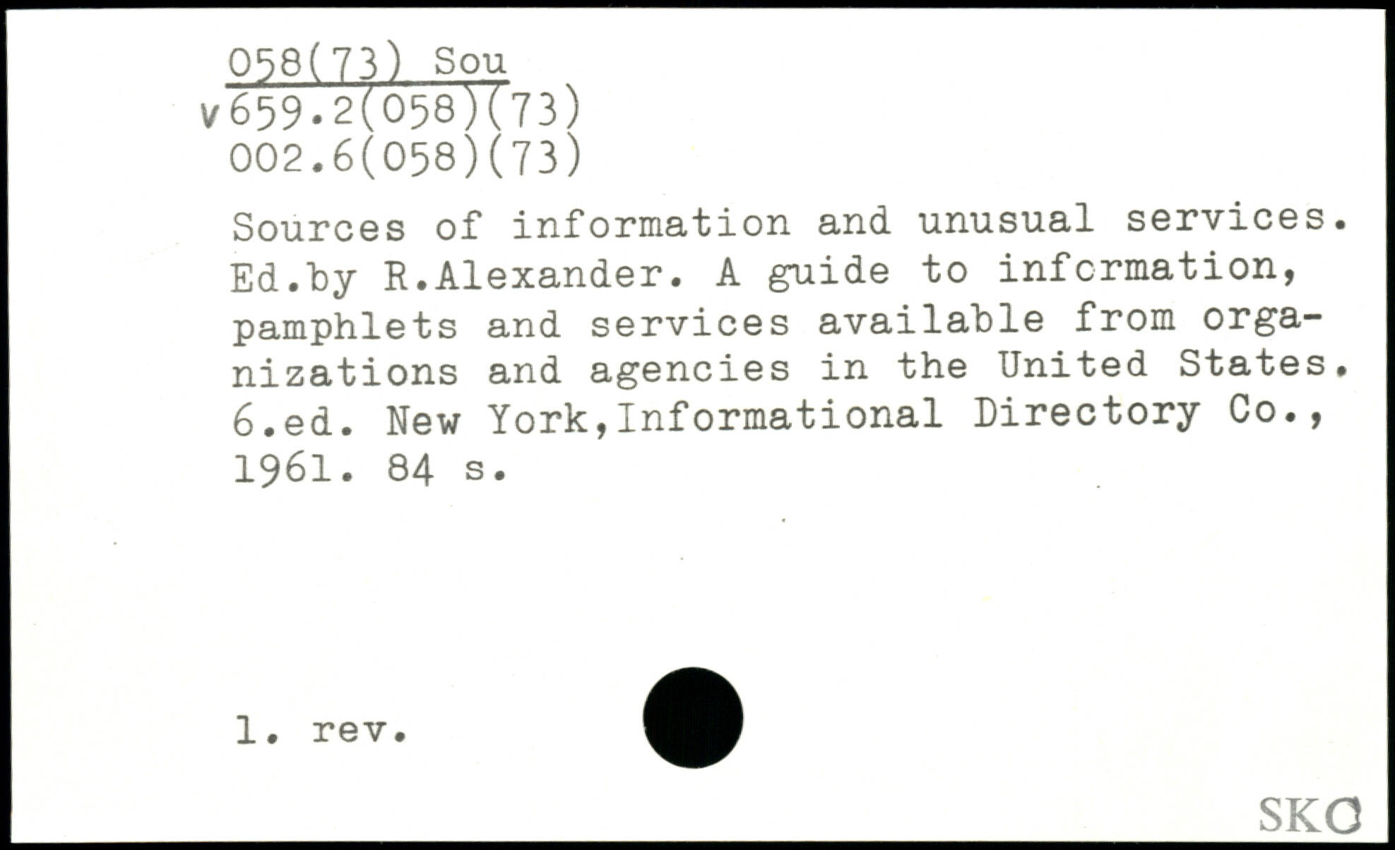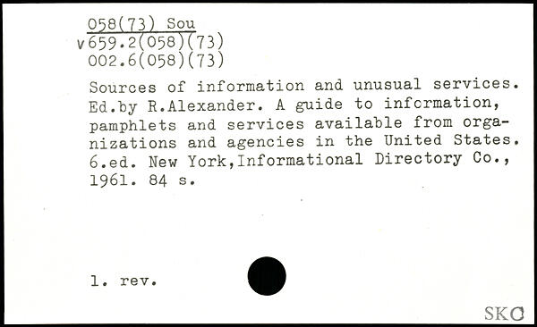 Sources of information and unusual services. Ed.by R.Alexander. A guide to information, pamphlets and services available from organizations and agencies in the United States.