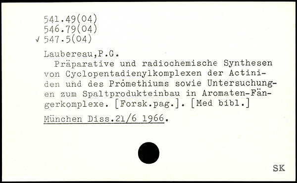 Präparative und radiochemische Synthesen von Cyclopentadienyikomplexen der Actini-den und des Promethiums sowie Untersuchungen zum Spaltprodukteinbau in Aromaten-Fängerkomplexe. [Forsk.pag.]. [Med bibl.] München Diss.2l/6 1966.