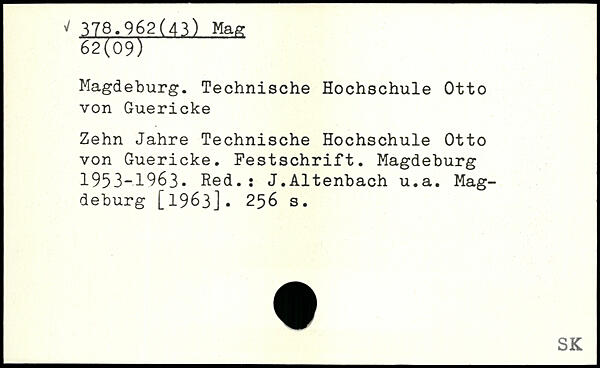 Magdeburg. Technische Hochschule Otto von Guericke Zehn Jahre Technische Hochschule Otto von Guericke. Festschrift. Magdeburg 1953-1963. Red.: J.Altenbach u.a. Magdeburg [1963].