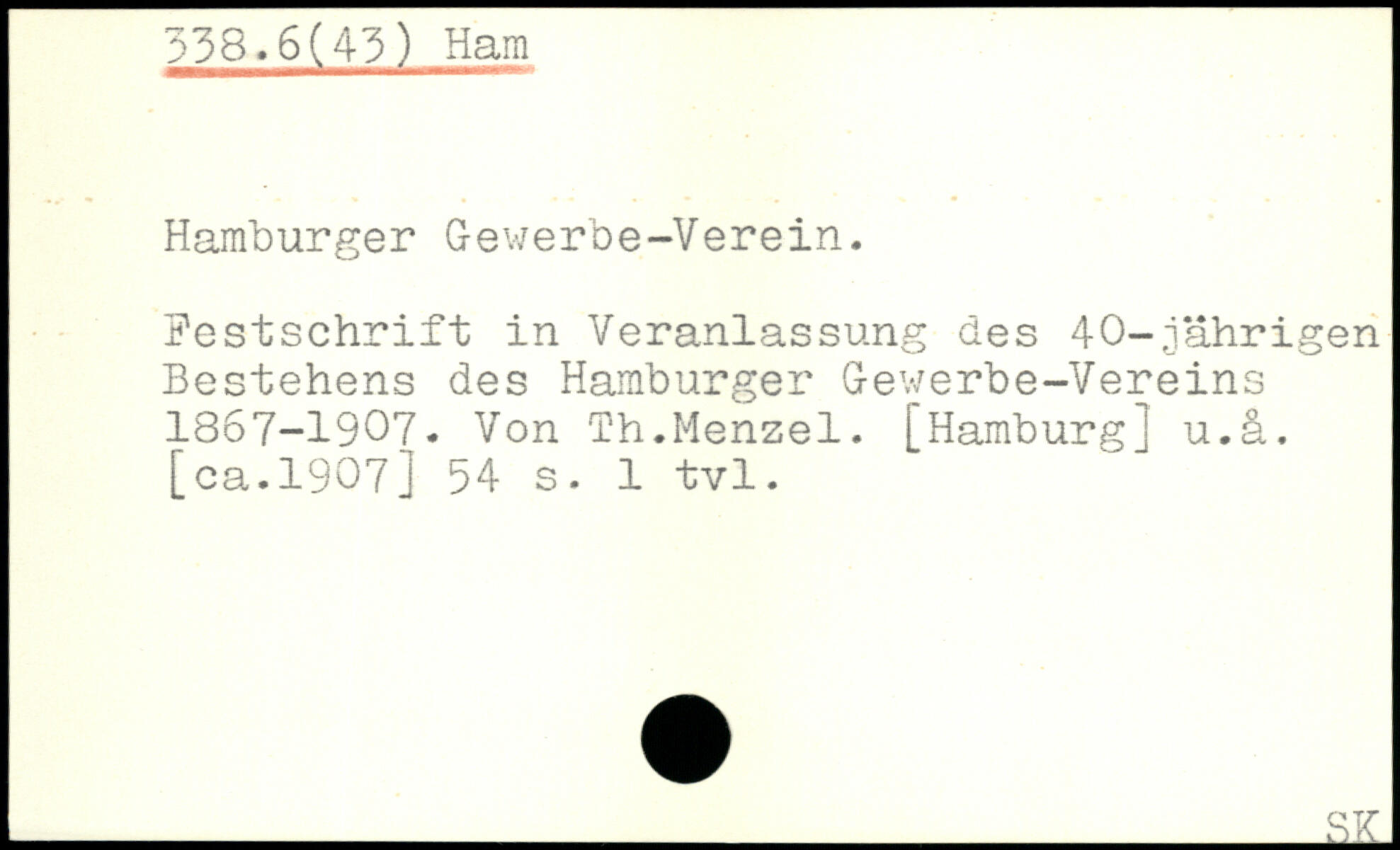 Hamburger Gewerbe-Verein. Festschrift in Veranlassung des 40-jährigen Bestehens des Hamburger Gewerbe-Vereins 1867-1907. Von Th.Menzel. [Hamburg] u.ä.