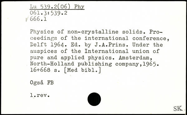 Physics of non-crystalline solids. Proceedings of the international conference, Delft 1964. Ed. by J.A.Prins. Under the auspices of the International union of pure and applied physics.