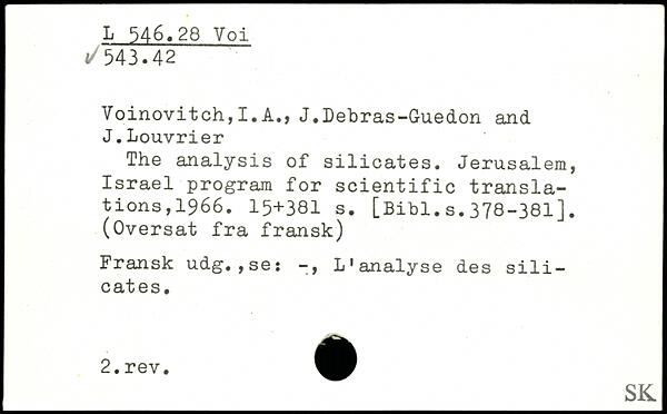 Voinovitch,I.A., J,Lebras-Guedon and J.Louvrier The analysis of silicates. Jerusalem, Israel program for scientific translations, 1966.