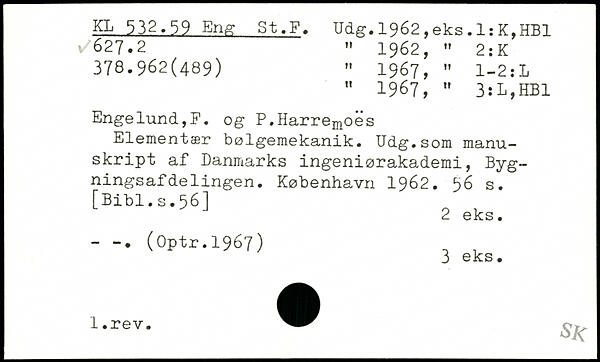 " 1967, M 3:L,HB1 Engelund,F. og P.Harremoes Elementær bølgemekanik. Udg.som manuskript af Danmarks ingeniørakademi, Byg-ningsaf delingen.